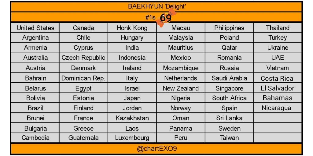 Danh sách 69 quốc gia mà Delight đã đạt #1 trên iTunes.