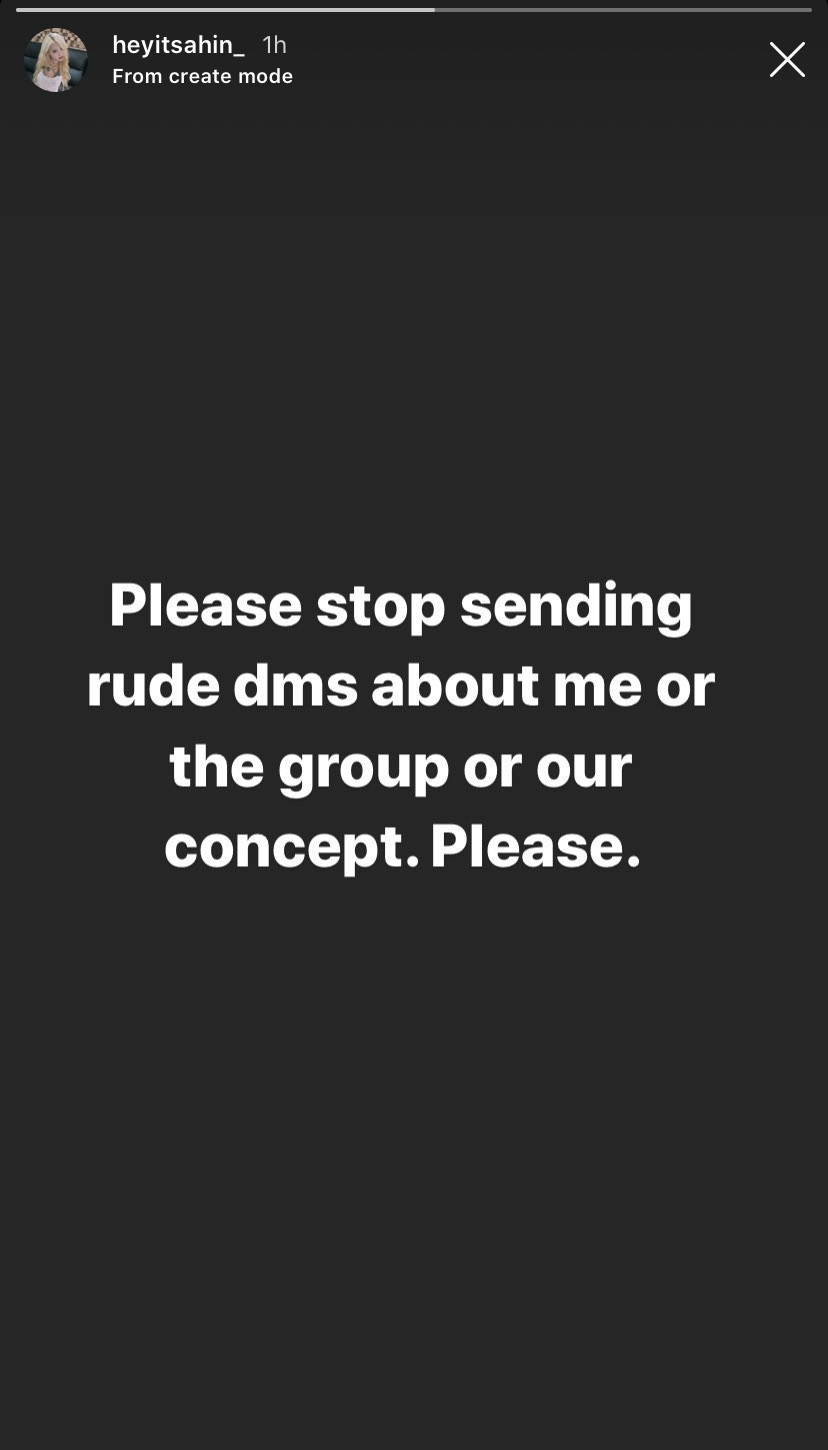 Cụ thể, Ahin đã đăng tải lên story instagram của mình nội dung thể hiện sự tức giận sau khi nhận được tin nhắn của một fan gửi đến, đó là: “Làm ơn đừng gửi cho tôi những tin nhắn thô lỗ về tôi, nhóm của tôi và concept nữa. Làm ơn.” Ngay sau đó người được nhắc đến trong story của Ahin cũng để lại bình luận ở bài đăng mới nhất của cô rằng: “Hãy dừng những vũ đạo sáo rỗng như hôn hay vỗ tay đi. Bạn có thể comeback với một concept mạnh mẽ hay hưng phấn hơn không? Danh tiếng của các bạn đang ở mức thấp nhất đấy. Có ai ở đây ghét concept các bài hát của họ không? Chúng tôi muốn một điều gì đó mới hơn, mặc dù hâm mộ các bạn nhưng tôi thực sự chán đến hối hận.”
