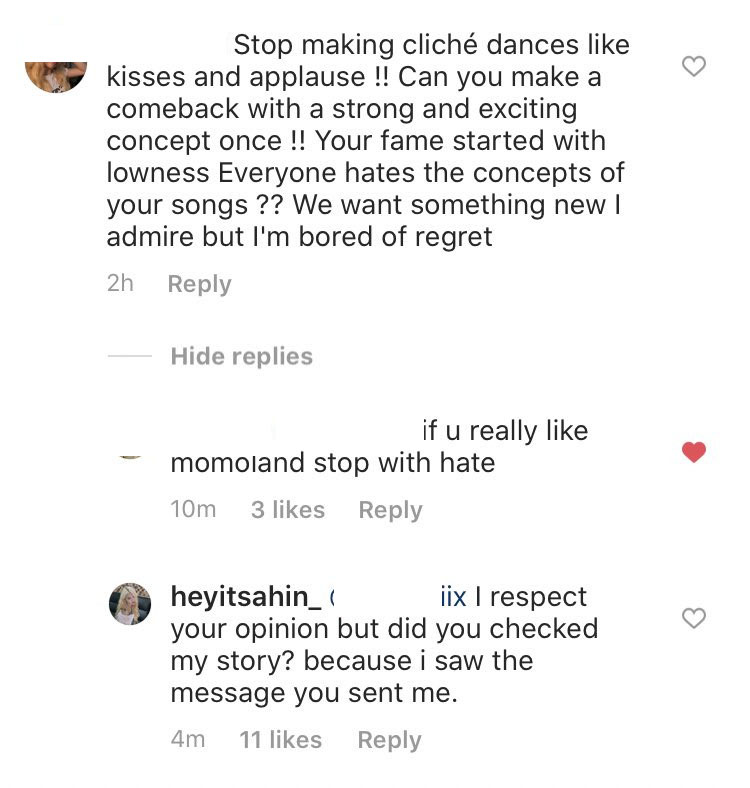 Theo đó, người hâm mộ này đã cho rằng concept và vũ đạo của các bài hát của MOMOLAND khá nhàm chán, người này mong muốn MOMOLAND sẽ mang đến những phong cách mới hơn. Việc concept tương đồng của MOMOLAND trước đây đã được nhắc đến rất nhiều, sau khi nổi lên với Bboom Bboom, những ca khúc sau là BAAM, I’m So Hot đều có cấu trúc bài hát giống nhau, mang đến cảm giác không sáng tạo và thiếu đổi mới ở mỗi lần comeback của MOMOLAND, vì thế ở lần trở lại sắp tới, với những hứa hẹn thay đổi concept của công ty chủ quản, các fan cũng đặt rất nhiều kỳ vọng về màn thay đổi của các cô gái.
