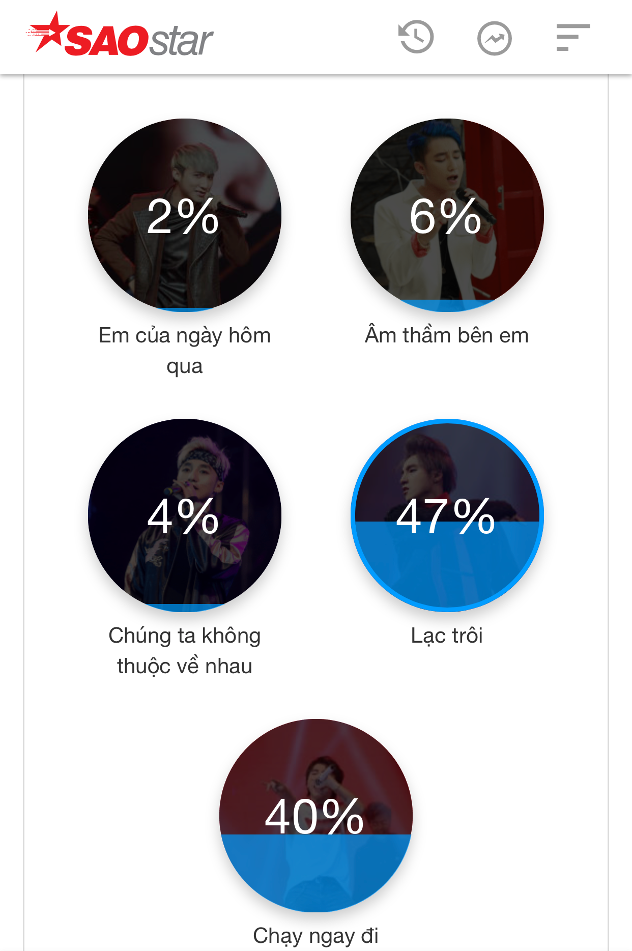 Ngay sau khi bài viết Hot phải như Sơn Tùng: Màn live đầu tiên thôi mà cũng 'rần rần' chẳng thua gì MV lên sóng, đông đảo bạn đọc cũng như fan của anh chàng này đã tham gia cuộc “biểu quyết” từ Saostar để lựa chọn màn live đầu tiên đáng mong chờ nhất. Và thật bất ngờ không phải Chạy ngay đi, với 47% Lạc trôi mới là ca khúc mà độc giả Saostar thích thú nhất với sân khấu live đầu tiên.