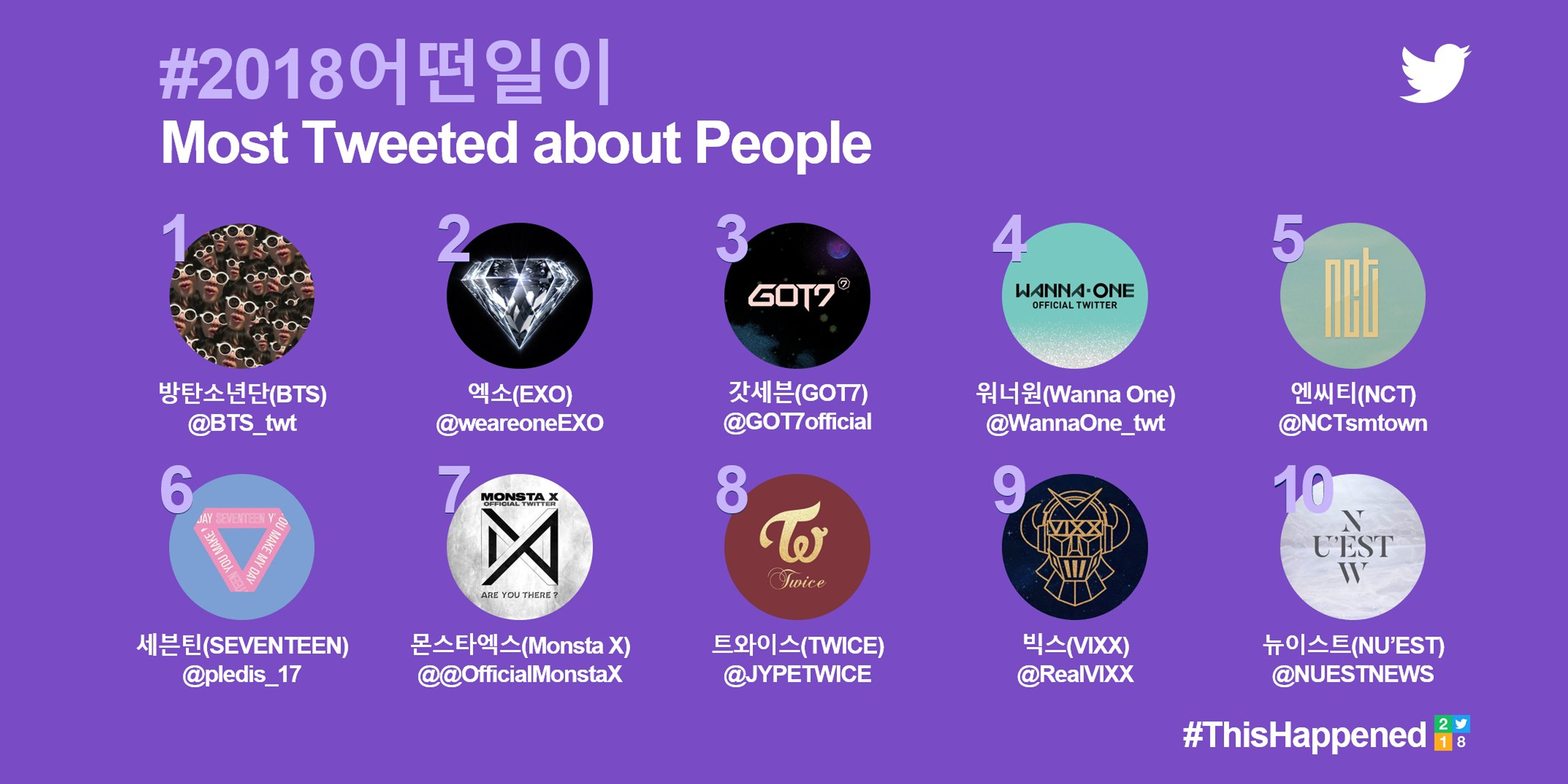 Đứng đầu danh sách chính là nhóm nhạc nam nhà Big Hit - BTS với hơn 17,2 triệu người theo dõi. Trong năm vừa qua, các chàng trai đã rất chăm chỉ cập nhật Twitter của mình và từ đó giúp họ vững chắc ở vị trí dẫn đầu. Các vị trí tiếp theo lần lượt là EXO, GOT7, Wanna One, NCT, Seventeen, MonstaX,…