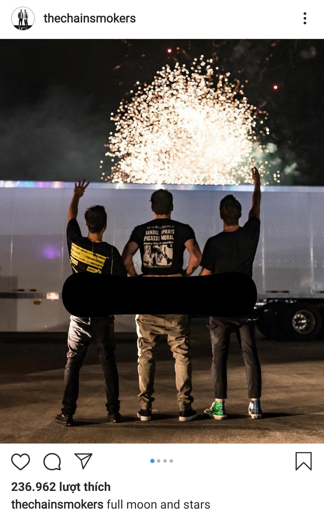 Mới đây, cộng đồng người hâm mộ US-UK đã được một phen mắt tròn mắt dẹt khi xem qua bài đăng mới nhất của bộ đôi DJ The Chainsmokers. Cụ thể, The Chainsmokers đã chia sẻ hình ảnh đứng xem pháo hoa cùng với một người bạn sau khi kết thúc phần trình diễn tại một lễ hội âm nhạc hoành tráng. Sẽ không có gì đáng nói nếu như trong bức ảnh, bộ đôi DJ cùng với người bạn của mình không… cố tình kéo quần xuống thấp để lộ vòng 3 căng mọng. Chắc chắn nhiều người sẽ phải đỏ mặt tía tai khi tình cờ lướt qua bức ảnh “nóng bỏng” này của The Chainsmokers với dòng caption đầy ẩn ý: “Fullmoon and stars” (Trăng tròn và những vì sao).