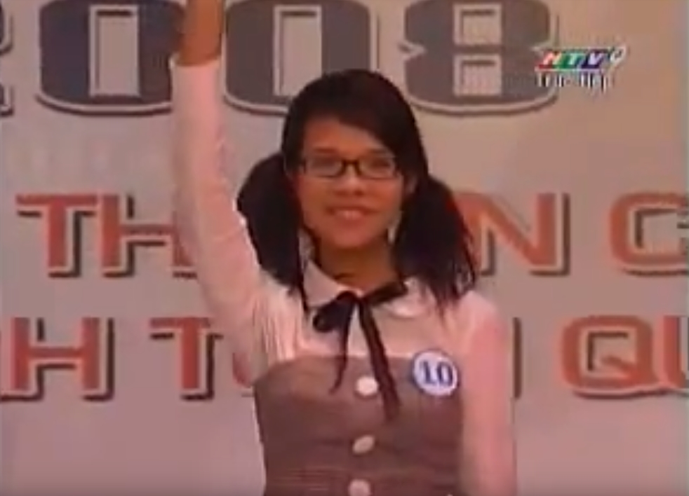 Vũ Cát Tường với kiểu tóc cột hai bên ngộ nghĩnh. Cô là học sinh giỏi Hoá và đang còn học trường chuyên Thoại Ngọc Hầu, tỉnh An Giang.