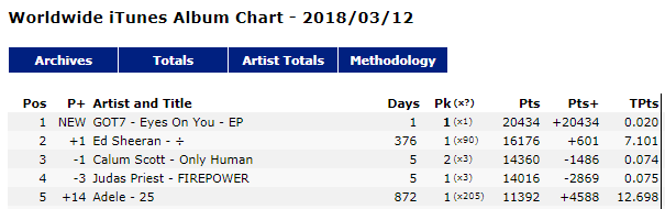 Nhờ những cố gắng mà đợt comeback mới nhất từ GOT7 đã gặt hái nhiều thành tích ấn tượng ở cả thị trường Hàn Quốc lẫn nước ngoài. Đầu tiên phải nói đến việc Look - bài hát chủ đề của mini album Eyes on You phát hành ngày 12/3 đã debut tại BXH Melon ở vị trí… 24. Dù đây là một thứ hạng không cao nếu so với nhiều “quái vật nhạc số” nhưng đối với GOT7 và các fan thì đây là một cột mốc ý nghĩa.