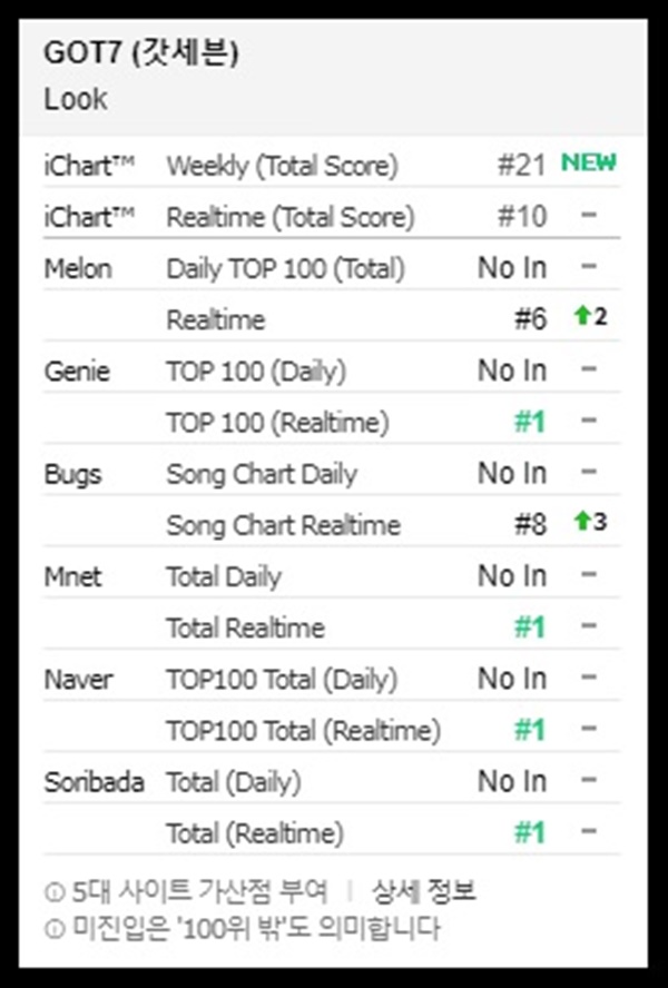 Look đến nay đã vượt lên đến hạng 6 trên Melon và No.1 nhiều BXH khác. Thành thích mảng nhạc số của GOT7 lần trở lại này đã cao hơn hẳn lúc trước.