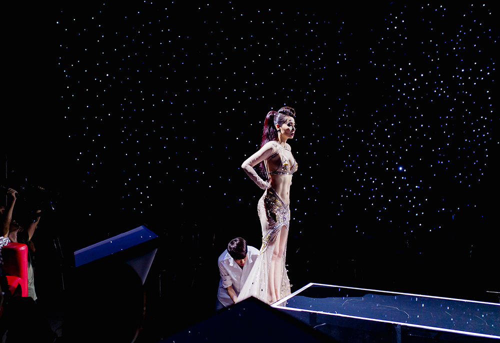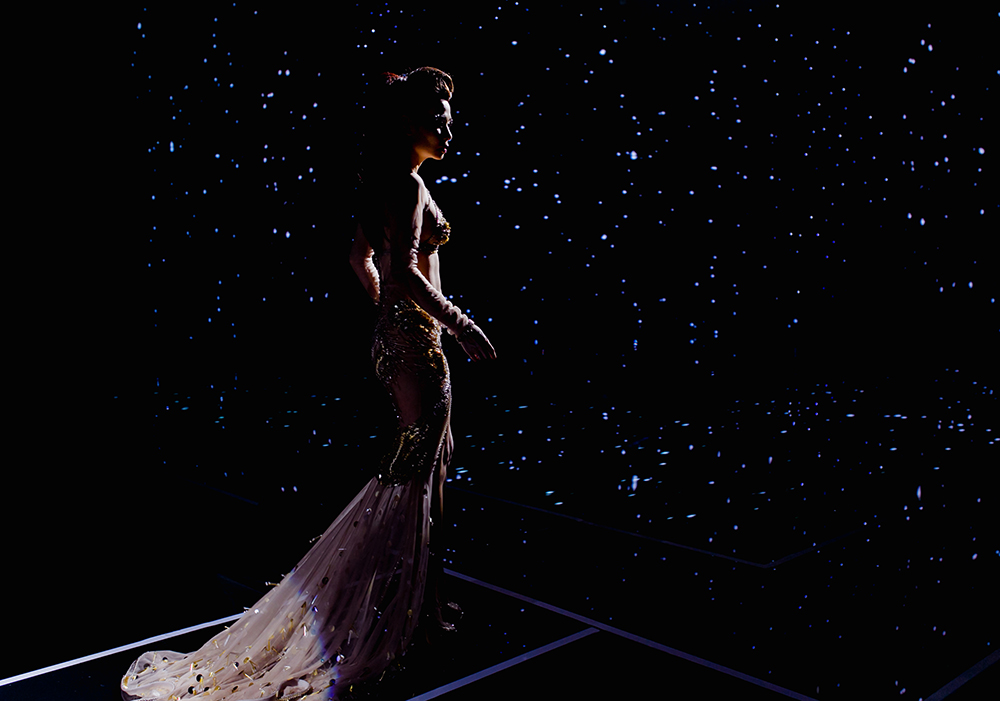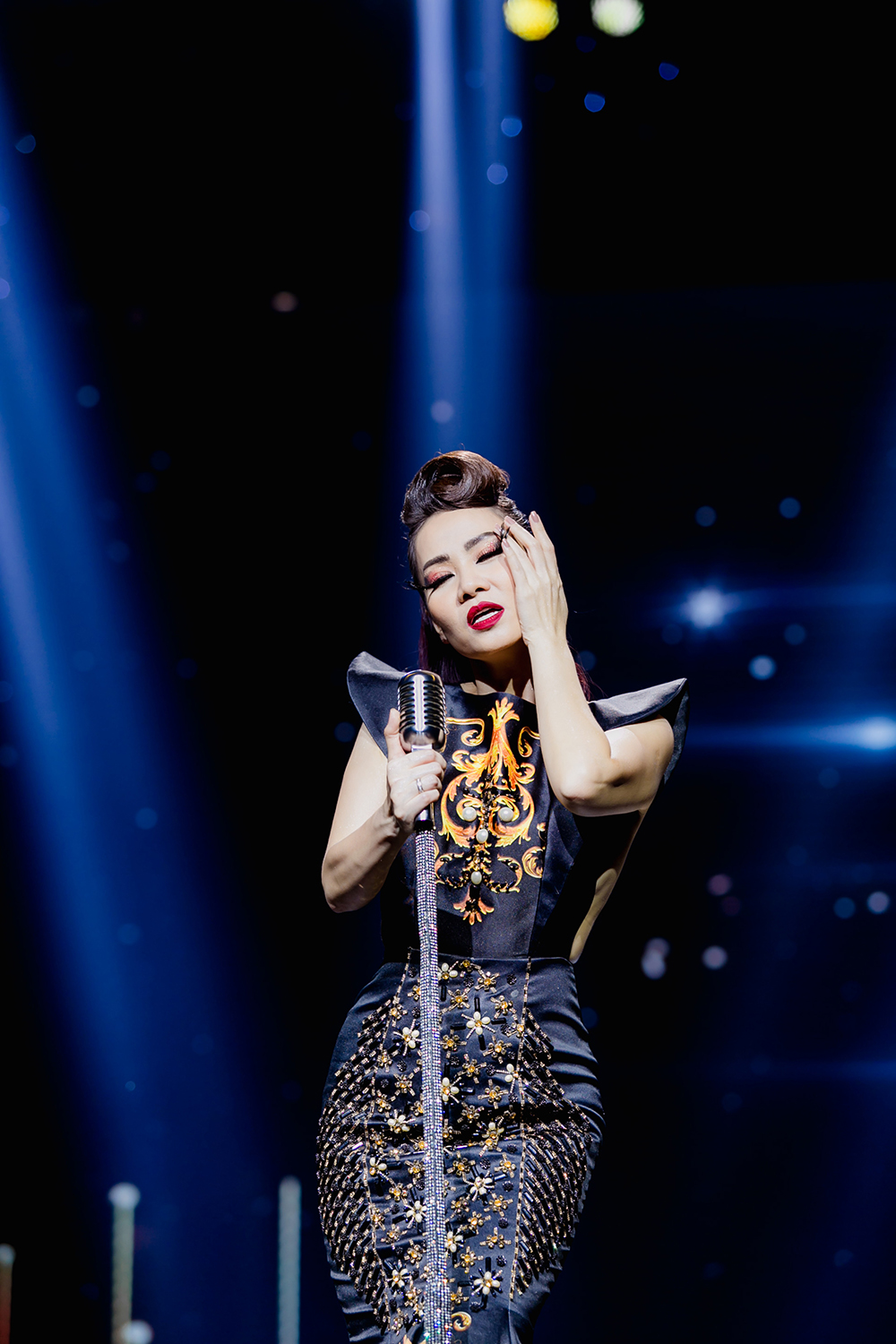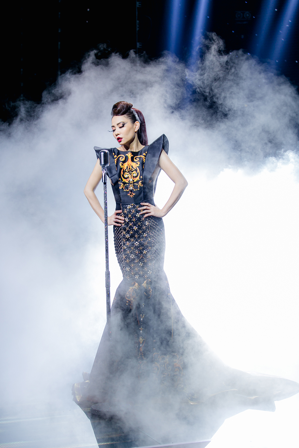 Hình ảnh Thu Minh đầy quyền lực với trang phục mang dáng dấp phượng hoàng từ đôi mắt phượng đến đuôi váy thêu loài chim cao quý này.