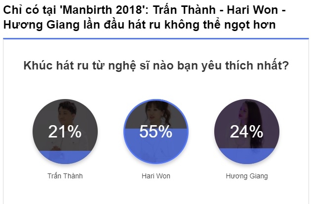 Và sau khi bài viết Chỉ có tại 'Manbirth 2018': Trấn Thành - Hari Won - Hương Giang lần đầu hát ru không thể ngọt hơn lên sóng, đông đảo bạn đọc đã tham gia vào cuộc biểu quyết cùng Saostar xem nghệ sĩ nào là người hát ru được yêu thích nhất. Và thật bất ngờ khi kết quả chung cuộc, chiến thắng đã thuộc về 55% lượt vote dành cho Hari Won với khúc ru đặc biệt bằng tiếng Hàn được thể hiện bằng những chan chứa tình cảm gửi gắm qua từng câu hát.