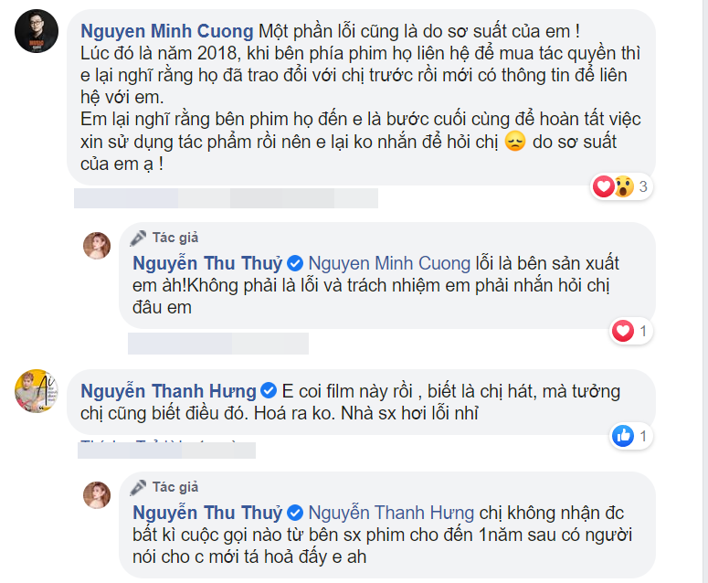 Dưới phần bình luận, tác giả ca khúc là nhạc sĩ Nguyễn Minh Cường cũng nhận một phần lỗi là do sơ suất của mình khi chưa thông qua ý kiến Thu Thủy. Tuy nhiên, nữ ca sĩ cứng rắn cho rằng đây là trách nhiệm thuộc về nhà sản xuất của bộ phim chứ không phải lỗi của tác giả ca khúc.