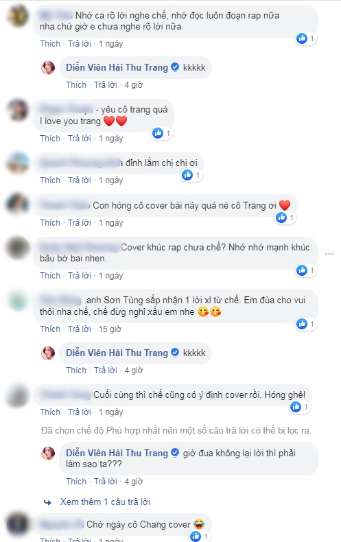 Hàng loạt bình luận bày tỏ sự mong chờ bản cover Hãy trao cho anh của diễn viên Thu Trang. Các fan còn không quên dặn cô hãy đọc cả rap của ca khúc này.