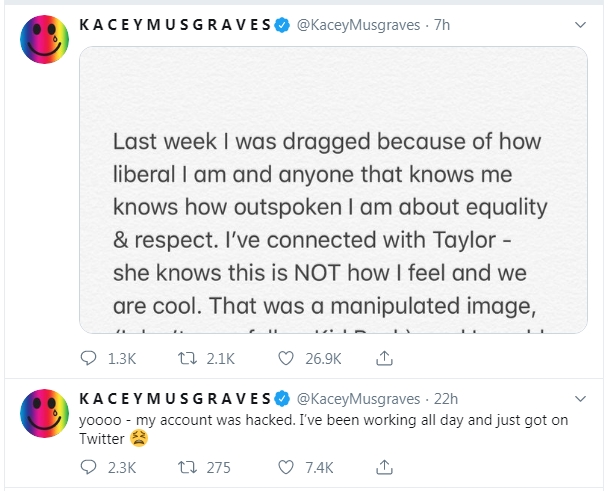 Kacey Musgraves sau đó đã unlike tweet của Kid Rock và ngay lập tức đăng tweet đính chính lại sự việc. Cô chia sẻ rằng tài khoản của cô đã bị ai đó hack và cô không hề biết gì về việc like tweet ấy. Có vẻ vẫn chưa đủ, Kacey sau đó cũng đăng thêm một tweet khác kể rõ hơn về sự việc: “Tuần rồi tôi đã bị kéo vào một đống rắc rối bởi vì tôi vốn là người rộng rãi và bất kì ai nếu có biết tôi thì đều sẽ nhận thấy rằng tôi thẳng thắn thế nào về bình đẳng giới và sự tôn trọng. Tôi đã liên lạc với Taylor. Cô ấy biết tôi không làm điều này và dĩ nhiên chúng tôi vẫn ổn. Bức ảnh tôi like tweet Kid Rock đã bị thao túng (tthậm chí tôi còn chẳng theo dõi anh ta) và tôi cũng sẽ không bao giờ ủng hộ bất kì một thông điệp kinh tởm nào về việc hạ bệ một người phụ nữ như thế.” Ngay sau đó, nàng rắn chúa cũng đã ấn like tweet của Kacey để xác thực lời nói của cô nàng là đúng.