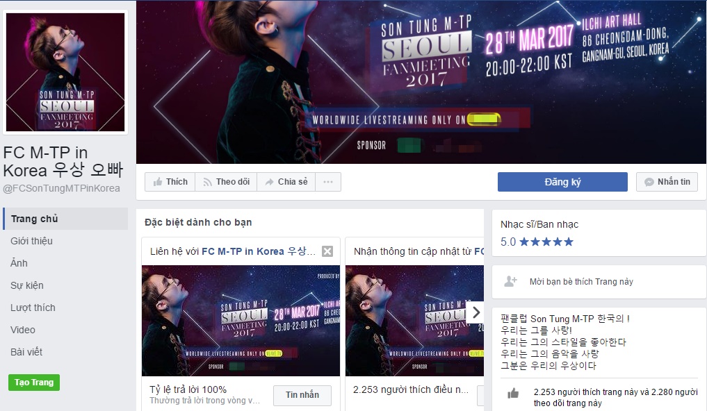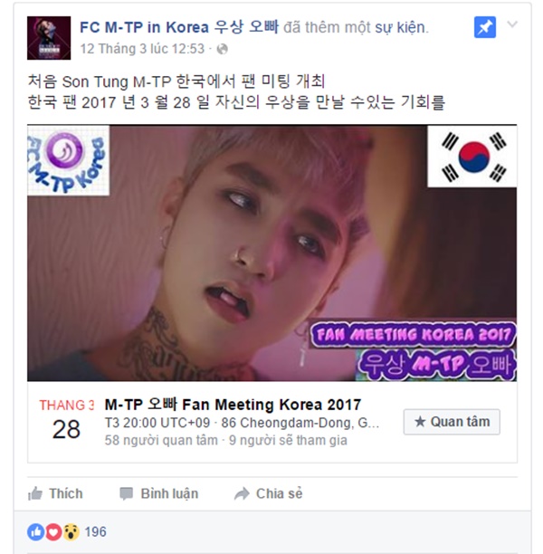 Fanpage Hàn Quốc nhanh chóng cập nhật sự kiện fanmeeting tại Seoul của Sơn Tùng vào ngày 28/3 tới đây.