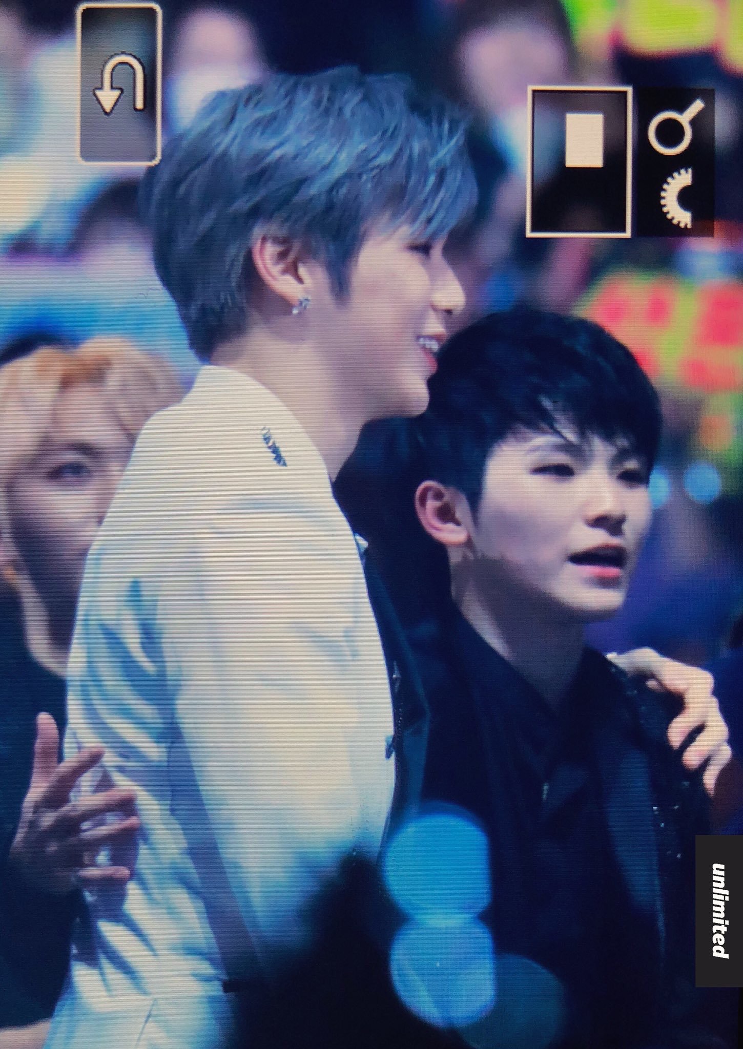 Woozi gửi lời chúc mừng đến Kang Daniel thông qua camera chương trình.