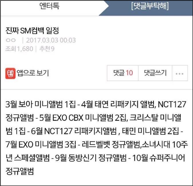 Mới đây, một nguồn tin trên trang Pann hé lộ loạt thời gian trở lại của các nghệ sĩ nhà SM trong năm 2017 đã thu hút sự chú ý từ cư dân mạng. Tuy chưa được công ty này xác nhận nhưng thông tin tái xuất này khá phù hợp với lịch trình cá nhân của mỗi nghệ sĩ, khiến các fan không thể ngó lơ.