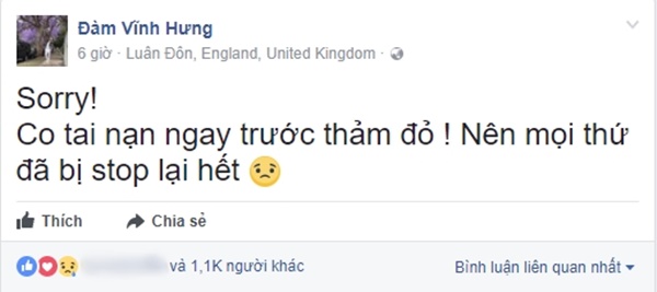 Tuy nhiên tới phút chót, một sự cố không may xảy ra khiến Đàm Vĩnh Hưng không thể đi thảm đỏ như dự kiến. Khoảng 4h sáng ngày 13/11, nam ca sĩ chia sẻ trên trang cá nhân: “Xin lỗi. Có tai nạn ngay trước thảm đỏ nên mọi thứ đã bị dừng lại hết”.