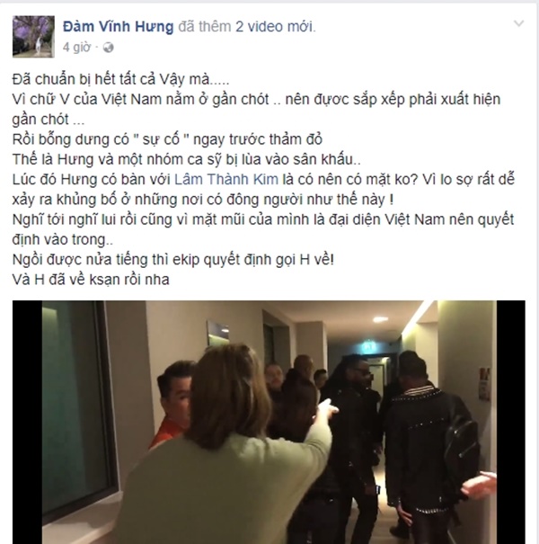Không lâu sau đó, Đàm Vĩnh Hưng tiếp tục chia sẻ dòng trạng thái thứ hai giải thích rõ hơn về sự việc: ”Vì chữ V của Việt Nam nằm ở gần chót nên được sắp xếp xuất hiện ở gần cuối. Rồi bỗng dưng có “sự cố” ngay trước thảm đỏ. Thế là Hưng và một nhóm ca sĩ bị lùa vào sân khấu…”. Sau khi bàn bạc với trợ lý và lo sợ xảy ra khủng bố, đồng thời suy nghĩ bản thân là đại diện Việt Nam nên Mr. Đàm quyết định vào trong khán phòng. Nửa tiếng sau, ekip quyết định gọi anh về khách sạn.