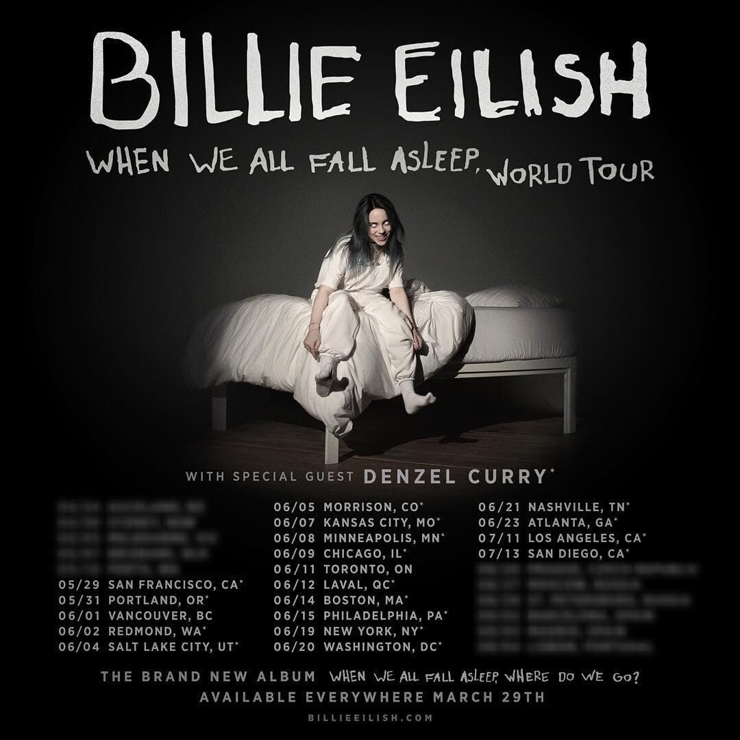 Để giải thích cho lí do vì sao tại thị trường Mỹ, tự nhiên Billie Eilish lại nhận được sự quan tâm tăng vọt đến bất thường như thế thì chỉ có thể lí do là: cô nàng này đã công bố tour lưu diễn vòng quanh thế giới của mình mang tên When We All Fall Asleep World Tour vào tháng 5 này khi chỉ mới 17 tuổi, hiện cô cũng đã bắt tay vào khâu quảng bá cho tour lưu diễn này. Còn thành công hay không, ta còn phải đợi đến lúc đó.