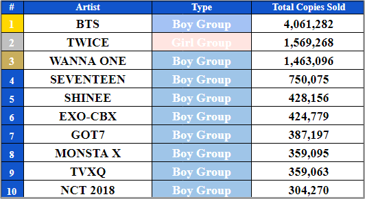 Các vị thứ còn lại thuộc về SEVENTEEN với 750 ngàn bản, SHINee với 428 ngàn, EXO-CBX với 424 ngàn, GOT7 với 387 ngàn, Monstar X với 359 ngàn, TVXQ với 359 ngàn và cuối cùng là tân binh NCT 2018 với 304 ngàn bản.