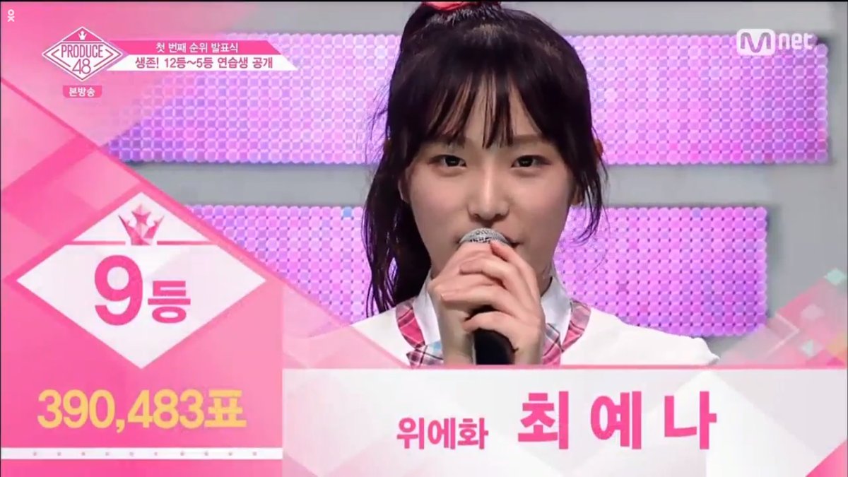 Hạng 9 - Choi Yena đến từ Yuehua Entertainment. Dù là nhân tố hoàn toàn mới nhưng sức hút của Yena quả là không thể đùa được. Khả năng hát hò ổn cùng với tình cách “mặn mà”… Yena đã chinh phục được trái tim của nhiều người.