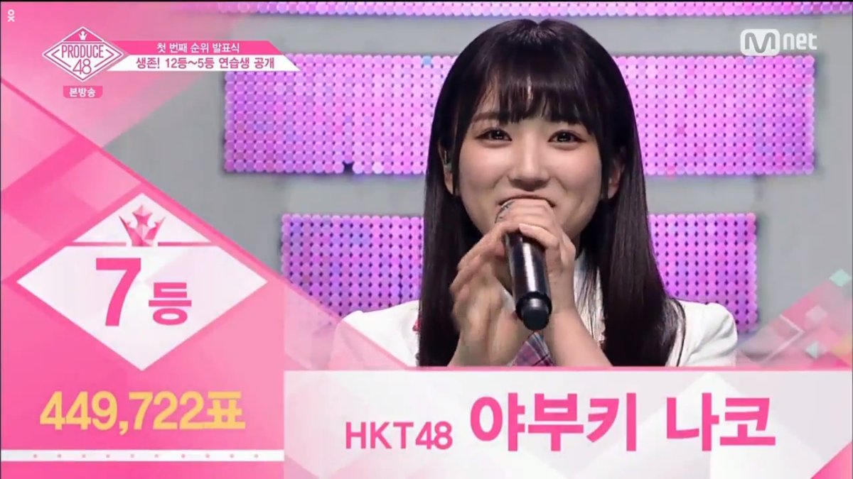 Hạng 7 - Yabuki Nako đến từ HKT48. Nako đã thăng hạng chóng mặt nhờ cú hit trong phần thi cover ca khúc Love Whisper. Đảm nhận vai trò hát chính, cô nàng này đã chinh phục nốt cao thần thánh vô cùng mượt mà khiến các thí sinh và dàn HLV ngỡ ngàng.