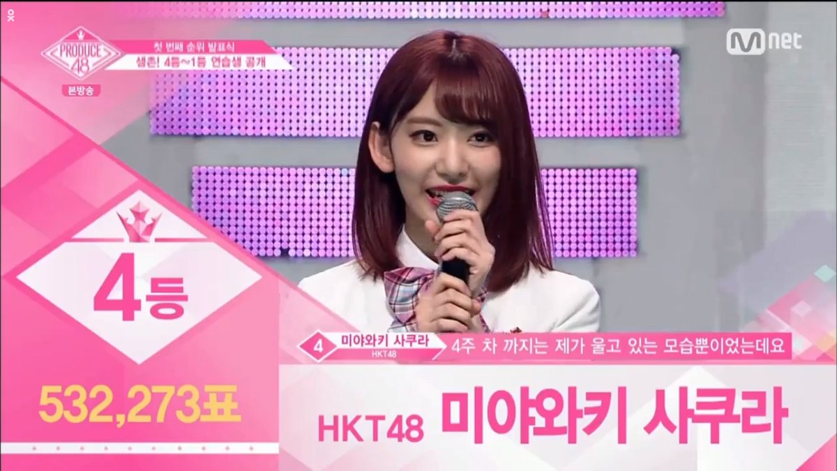 Hạng 4 - Miyawaki Sakura đến từ HKT48. Là ứng cử viên nặng kí cho ngôi vị No.1 nhưng Sakura lại tuột dốc trong sự bất ngờ của nhiều fan. Tuy nhiên, nếu cứ tiếp tục phong độ hiện tại thì cô nàng Center đầu tiên của Produce 48 vẫn nắm chắc 1 suất debut.
