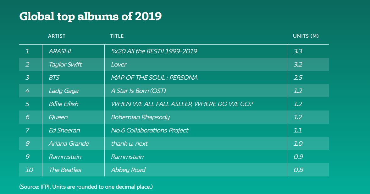 Sau 2 màn thống kê đầy kịch tính của hạng mục Ca khúc nổi bật và Nghệ sĩ bán chạy nhất hành tinh, nay IFPI - một trong những tổ chức uy tín nhất đại diện cho hãng đĩa khắp nơi trên toàn cầu, đã tiếp tục công bố kết quả “cuộc việt dã” của danh mục Những album xuất sắc nhất trong năm 2019. Và không thể khác hơn, danh sách đã thu hút khá nhiều sự chú ý từ dân mạng khắp nơi.