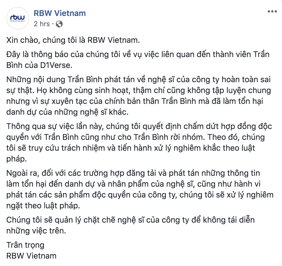 Sau khi scandal bị tố bắt cá hai tay và nói xấu “tiền bối” cùng công ty là MAMAMOO và ONEUS, nam thành viên Trần Bình đã bị công ty chủ quản ra quyết định chấm dứt hợp đồng, cho rời nhóm D1Verse, đồng thời thông báo sẽ “truy cứu trách nhiệm và tiến hành xử lý nghiêm khắc theo luật pháp”. Bên cạnh đó, trong thông cáo từ phía công ty quản lí đã đính chính những nội dung mà Trần Bình phát tán về các nghệ sĩ cùng công ty, cụ thể là 2 nhóm nhạc MAMAMOO và ONEUS, là hoàn toàn sai lệch. Bởi vì “họ không cùng sinh hoạt, thậm chí cũng không tập luyện chung nhưng vì sự xuyên tạc của chính bản thân Trần Bình mà đã làm tổn hại danh dự của những nghệ sĩ khác” - phía công ty chia sẻ.
