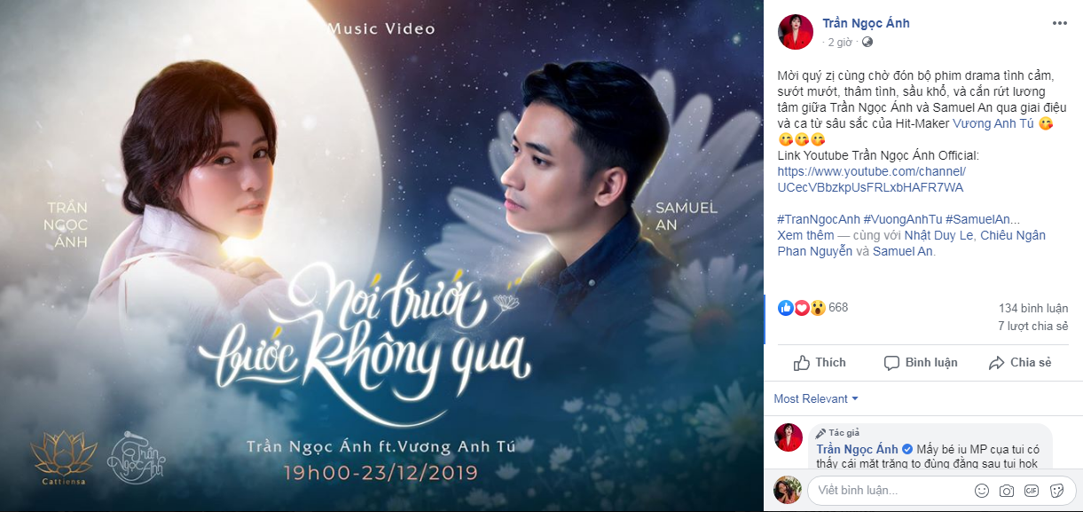 Với caption đầy hứa hẹn của mình, các fan hâm mộ không khỏi thích thú về MV sắp tới của cô nàng. Theo lời của khổ chủ, chắc hẳn đây sẽ là 1 MV phim ngắn với đầy đủ cung bậc cảm xúc có lẽ sẽ lấy đi nước mắt của người xem. Với sự góp mặt của Samuel An, khán giả càng thêm mong chờ vào ‘siêu phẩm’ lần này của cô nàng. Không chỉ mang đến những hứa hẹn về MV, Trần Ngọc Ánh cũng không quên “thả thính” về ca từ đầy sâu sắc được chắp bút bởi Vương Anh Tú - anh chàng đứng sau nhiều bản hit nổi tiếng. Phải chăng đây sẽ là 1 bản ballad đầy ngọt ngào và tình cảm.