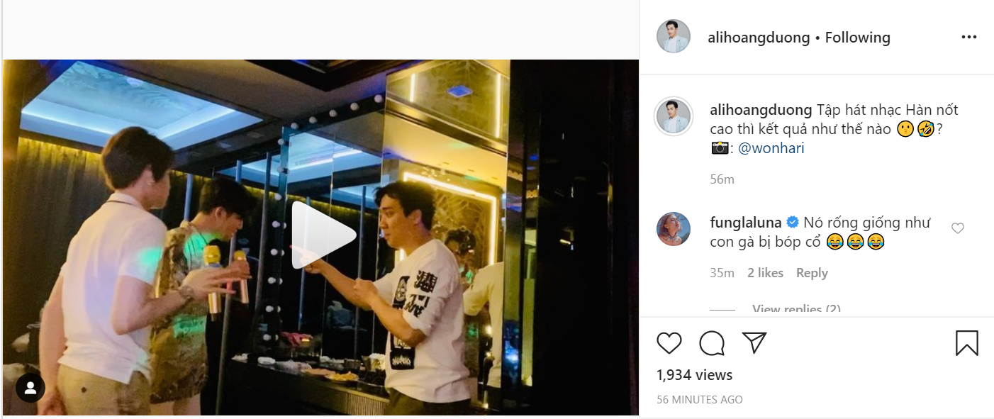 Cách đây không lâu, Ali Hoàng Dương đã chia sẻ trên trang Instagram đoạn clip tam ca cùng hai người bạn thân là Trấn Thành và Quang Trung. Đáng chú ý trong đoạn clip này, bộ ba không hát tiếng Việt mà đã “chơi lớn”cover một ca khúc Hàn Quốc trước sự chứng kiến của “người bản xứ” Hari Won.