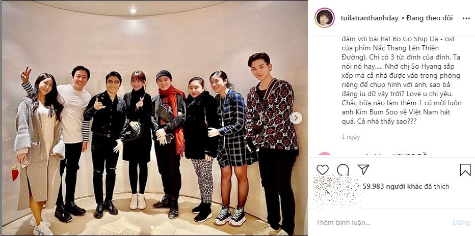 Cụ thể, chia sẻ trên Instagram cá nhân, Trấn Thành cho biết nhờ sự giúp đỡ của Diva So Hyang nên mới có cơ hội được theo dõi và gặp gỡ Kim Bum Soo tại hậu trường đêm diễn của nam ca sĩ: “Chỉ có 3 từ: đỉnh của đỉnh. Ta nói nó hay….. Nhờ chị So Hyang sắp xếp mà cả nhà được vào trong phòng riêng để chụp hình với anh, sao bả đáng iu dữ vậy trời?”. Không những vậy, vì quá yêu mến giọng ca của Kim Bum Soo mà Trấn Thành còn tiết lộ đang nung nấu ý định mời nam ca sĩ Hàn Quốc về Việt Nam trình diễn trong tương lai: “Chắc bữa nào làm thêm 1 cú mời luôn anh Kim Bum Soo về Việt Nam hát quá. Cả nhà thấy sao?“.