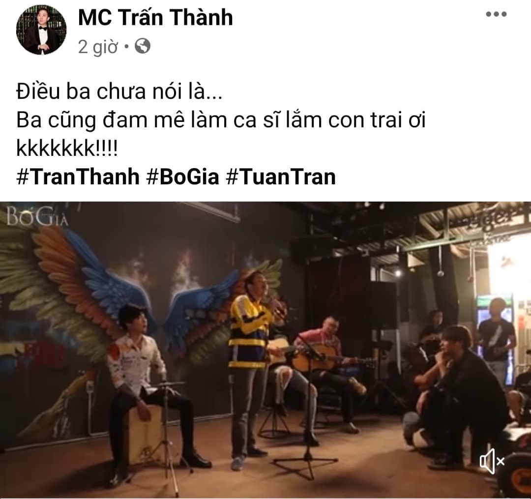Mặc dù webdrama Bố già kết thúc đã lâu, thế nhưng những “bí mật” hậu trường vẫn thường xuyên được Trấn Thành chia sẻ một cách nhỏ giọt trên mạng xã hội khiến fan vô cùng thích thú. Mới đây, nam diễn viên tiếp tục tung ra đoạn clip hậu trường ghi lại phân cảnh thị phạm cho Tuấn Trần một phân cảnh hát hò với ban nhạc, từng xuất hiện trong tập phim trước đó. Cụ thể, chia sẻ trên trang Fanpage, Trấn Thành đã viết: “Điều ba chưa nói là ba cũng đam mê làm ca sĩ lắm con trai ơi“.