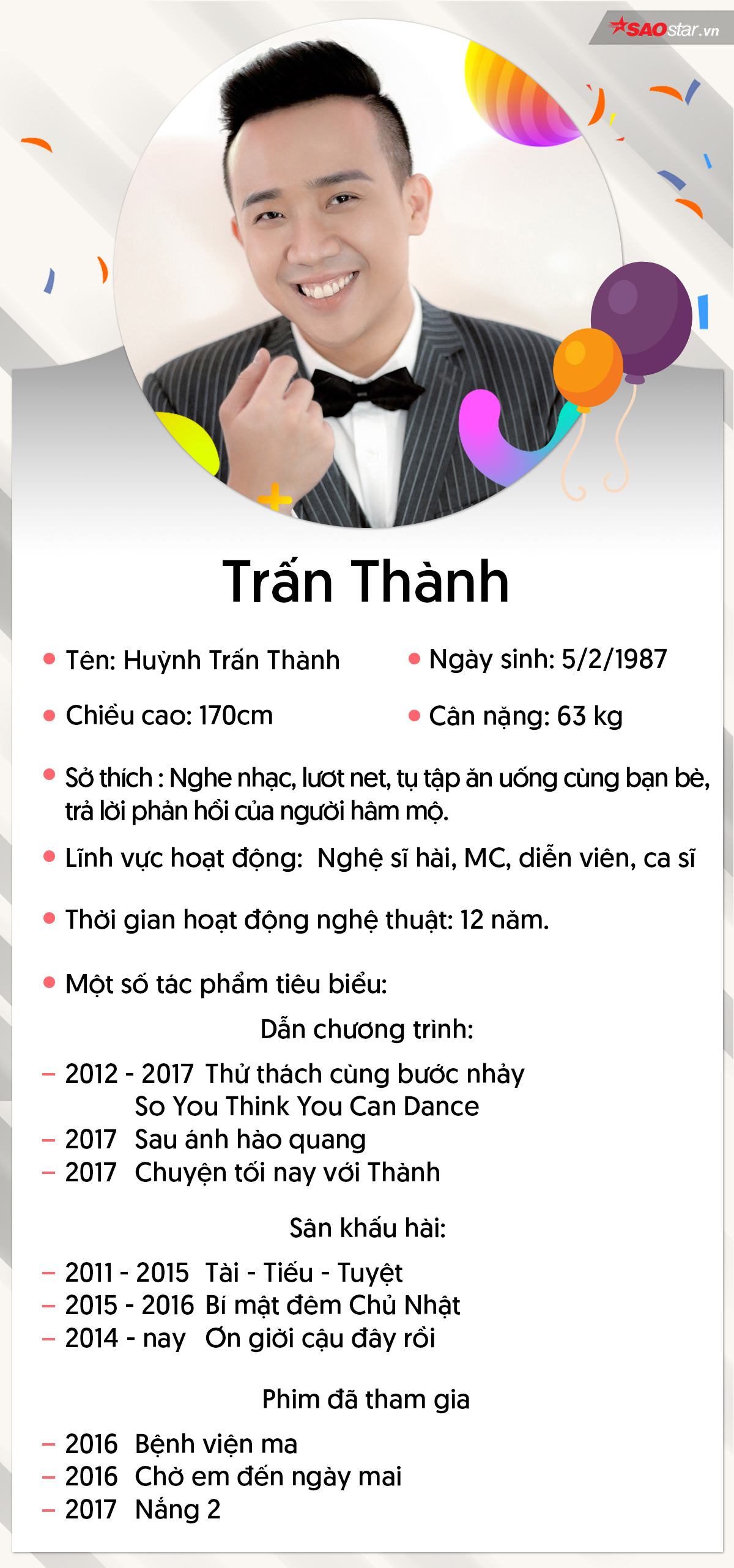 Là gương mặt quen thuộc với tần suất xuất hiện dày đặc trên sóng truyền hình, Trấn Thành được biết đến như một nghệ sĩ đa tài ở nhiều lĩnh vực như: MC, diễn viên, ca sĩ,.. Dù là vai trò nào anh cũng đều hoàn thành xuất sắc và gây được ấn tượng mạnh mẽ với công chúng. Hầu như hiếm có điều gì đủ khả năng làm khó được Trấn Thành, thiết nghĩ nếu nói rằng người đàn ông này sinh ra để làm nghệ thuật cũng không phải chuyện quá lời. Ở anh lúc nào cũng toát ra một nguồn năng lượng tích cực và lạc quan dù cho cuộc sống có bị bủa vây bởi vô vàn thị phi và áp lực.