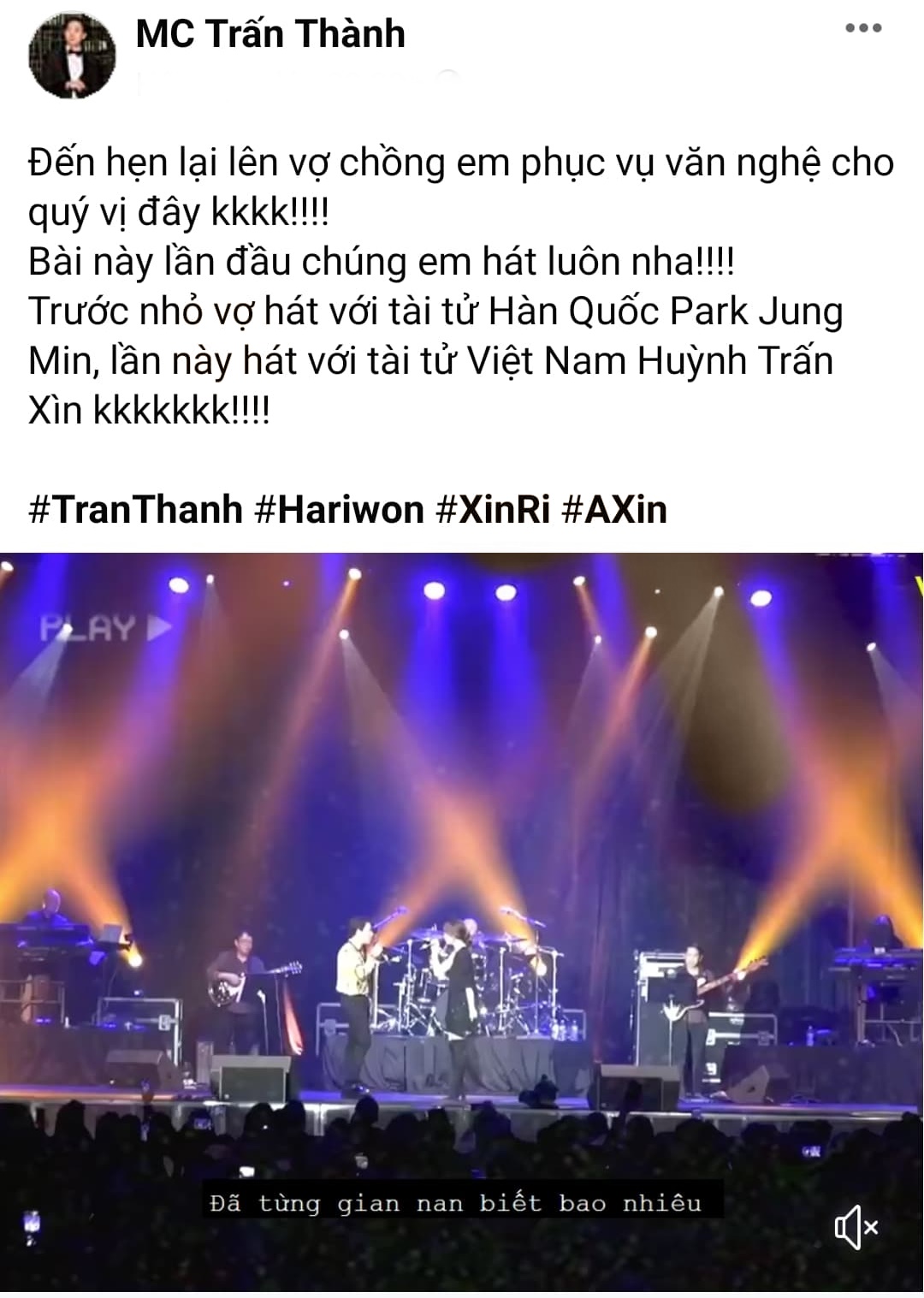 Cụ thể, trên trang Fanpage, Trấn Thành đã có bức tâm thư đậm chất “xéo sắc” nhưng không kém phần ngọt ngào: “Đến hẹn lại lên vợ chồng em phục vụ văn nghệ cho quý vị đây. Bài này lần đầu chúng em hát luôn nha! Trước nhỏ vợ hát với tài tử Hàn Quốc Park Jung Min, lần này hát với tài tử Việt Nam Huỳnh Trấn Xìn“.