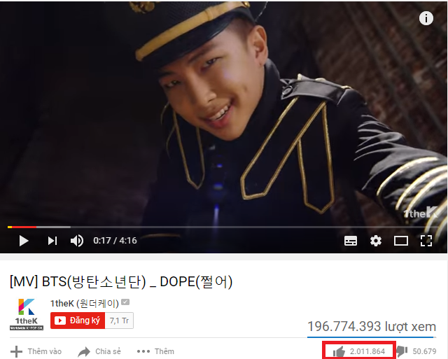 Sau nhiều nỗ lực để khẳng định bản thân, dường như BTS đã được người hâm mộ thế giới công nhận và ngày càng nổi tiếng, thành công hơn trên con đường âm nhạc. Để thể hiện lòng yêu mến đối với thần tượng, mới đây, cộng đồng Army (tên gọi fan BTS) vừa chung tay biến Dope - bản hit cũ của nhóm đạt con số 2 triệu lượt yêu thích trên Youtube. Trước mục tiêu vượt mốc 200 triệu lượt xem sắp thành hiện thực, cột mốc 2 triệu like như một món quà nhỏ đặc biệt nhằm cổ vũ tinh thần mà fan dành tặng cho các chàng trai nhà Big Hit.