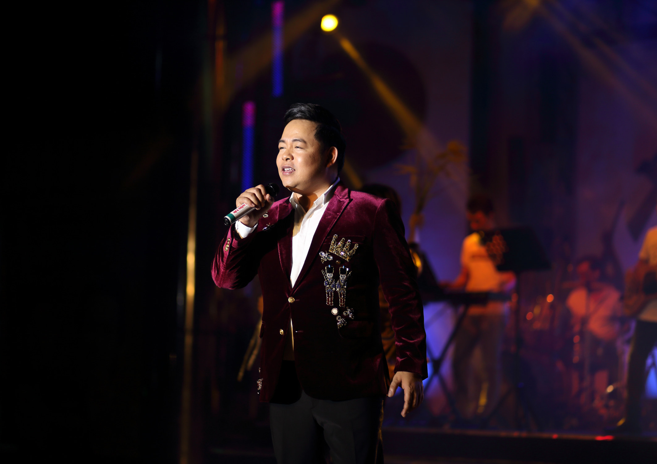 Quang Lê diện vest bảnh bao trên sân khấu.