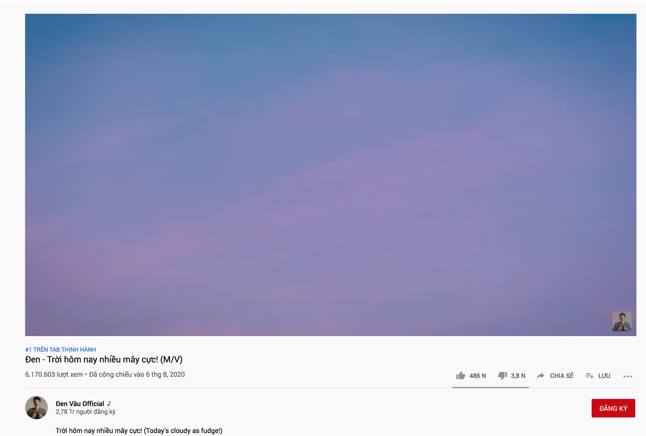 Tối 6/8, Đen Vâu đánh dấu màn quay trở lại đường đua nhạc Việt sau Một triệu like bằng MV có cái tên ngộ nghĩnh: Trời hôm nay nhiều mây cực. Sau 3 ngày ra mắt, dù đã có những dự đoán rằng lần này sẽ rất ít khả năng để leo lên top 1 nhưng đến sáng sớm ngày 10/8, MV đang sở hữu 6,1 triệu lượt view đã chính thức đặt chân lên No.1 top thịnh hành.