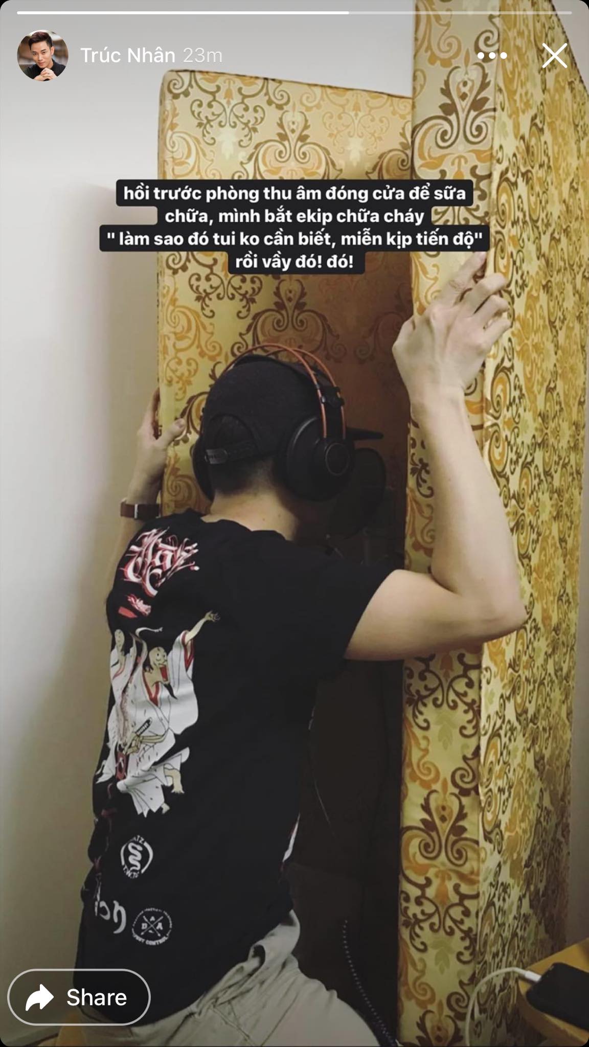 Mùa dịch Covid-19 đến, không có show diễn hay hoạt động ghi hình, đời sống sinh hoạt của các anh chị em ca sĩ trong phút chốc biến đổi đến không ngờ. Thay vì tất bật làm việc như mọi khi, họ chỉ còn biết ăn, ngủ, chơi, ngoài ra còn học hát, học đàn, học nhảy hay dành thời gian để sáng tạo âm nhạc mới. Thế nhưng, đến cả việc thu âm cũng bị hạn chế khi các phòng thu đều “bế quan toả cảng” thì phải ứng phó thế nào? Và Trúc Nhân với cái đầu sáng tạo vốn có đã chế ra hẳn một phòng thu tại nhà có một không hai, nhờ vào… chiếc đệm ngủ của mình.