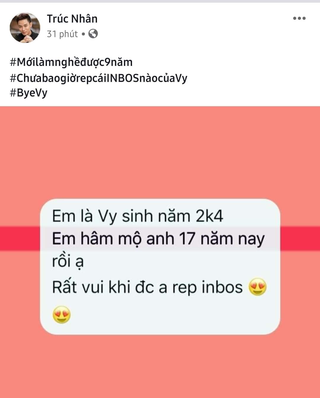 Mới đây, cộng đồng mạng đang vô cùng hào hứng chia sẻ câu chuyện hài hước của Trúc Nhân với một người khán giả có thể tạm được xem là… fan. Cụ thể, hình ảnh được Trúc Nhân chia sẻ trên trang cá nhân, chụp lại một lời nhắn “yêu thương” từ người khán giả này: “Em là Vy sinh năm 2004. Em hâm mộ anh được 17 năm nay rồi ạ. Rất vui khi được anh rep inbos (Inbox)“.