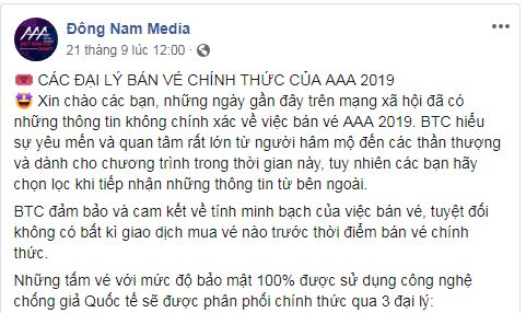 Trước đó, BTC AAA 2019 đã chính thức công bố bảng giá vé của chương trình sẽ được mở bán online thông qua 3 đối tác chính. Tuy nhiên, thông tin về thời gian mở bán vé chính thức vẫn chưa được công bố, cho nên tất cả các loại vé đang có mặt trên thị trường đều là vé đen và sẽ không được BTC chấp nhận. Thế nên những khán giả nào đang có ý định rút hầu bao để sở hữu tấm vé AAA 2019 cho mình thì phải hết sức tỉnh táo và chờ đợi những thông báo chính thức từ BTC chương trình để tránh tiền mất tật mang.