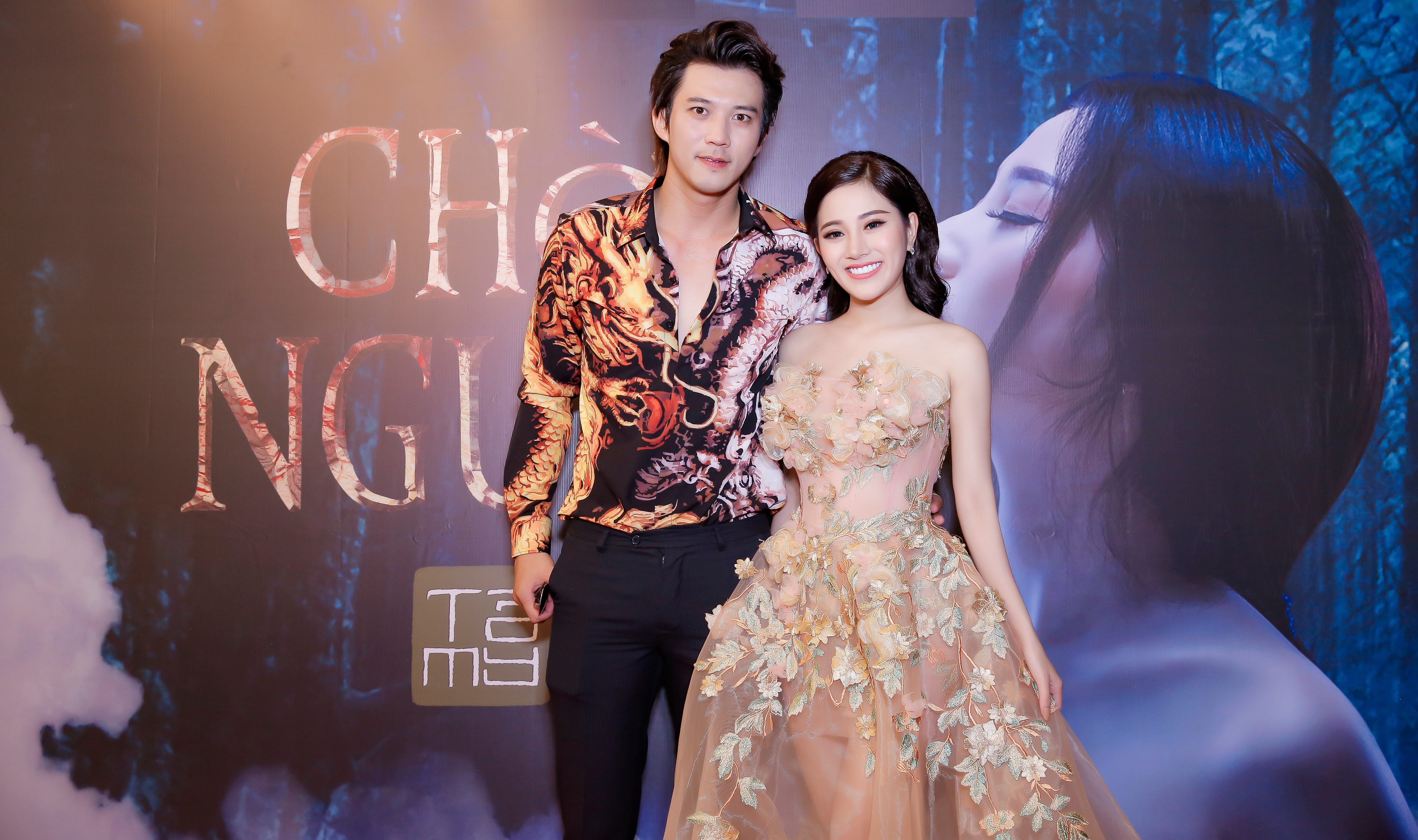 Tố My xinh đẹp bên bạn diễn nam trong buổi họp báo.