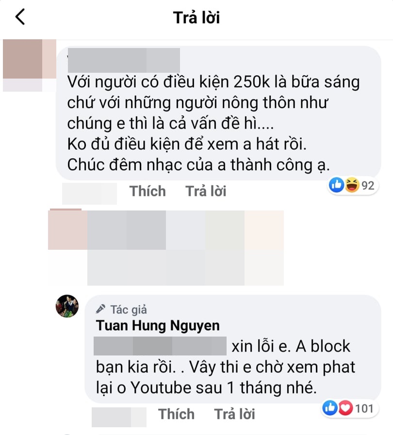 Cụ thể, một khán giả bình luận: “Với người có điều kiện 250.000 đồng là bữa sáng chứ với những người nông thôn như chúng em thì là cả vấn đề. Không đủ điều kiện để xem anh hát rồi. Chúc đêm nhạc của anh thành công”. Trước ý kiến này, Tuấn Hưng đã trực tiếp vào phản hồi: “Xin lỗi em. Anh block bạn kia rồi. Vậy thì em chờ xem phát lại ở Youtube sau 1 tháng nhé“. Tưởng chừng câu trả lời của Tuấn Hưng khá gắt gỏng, thế nhưng nếu hiểu theo nghĩa tích cực thì nam ca sĩ dường như đã có hành động thông cảm, block những ai chê bai bình luận phía trên.