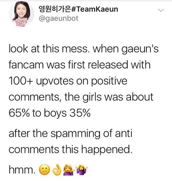 Lí giải cho việc này, người hâm mộ cho rằng một “tập đoàn” cư dân mạng nam giới hùng hậu đang bắt đầu tấn công, tẩy chay Kaeun bởi một số lí do vô cùng chủ quan và thiếu chứng cứ: Kaeun lớn tuổi, ngoại hình dừ, nhà sản xuất Produce 48 thiên vị cô nàng, Kaeun đã nói dối về chuyện hoạt động của After School…