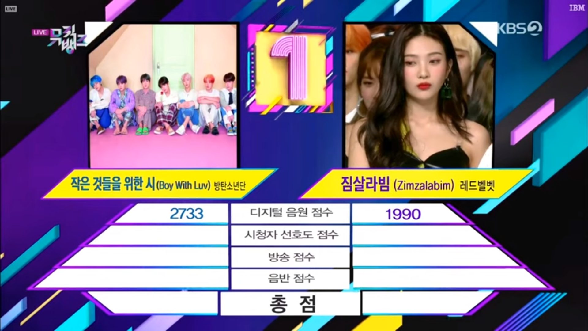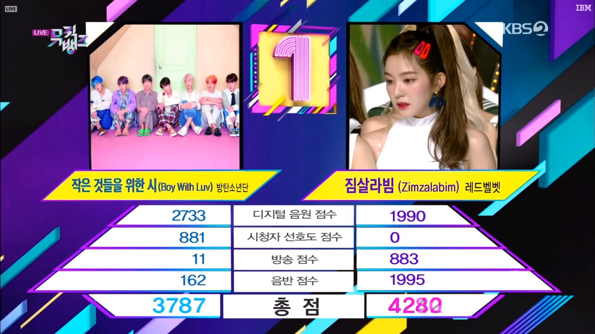 Kết quả cuối cùng, Red Velvet dành chiến thắng áp đảo với 4868 điểm, vượt qua đối thủ BTS với 3787. Có vẻ như sau 2 tháng lên sóng, ca khúc của các chàng trai nhà Big Hit đã dần hạ nhiệt để nhường chỗ cho các bản hit mới lên ngôi.