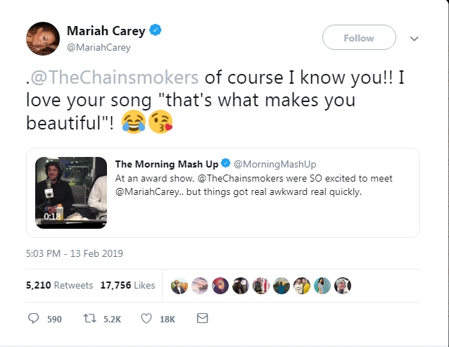 Mới đây, nữ diva đã đáp lại trên Twitter khi hai anh chàng của nhóm nhạc nổi tiếng The Chainsmokers bày tỏ sự quý mến đến Mariah Carey. Thế nhưng, hỡi ôi, có ai ngờ dòng tweet ấy lại nhầm lẫn tai hại đến thế này khi Mariah đã gửi đến The Chainsmokers: “Dĩ nhiên tôi biết các bạn!! Tôi yêu ca khúc “That's what makes you beautiful” của các bạn!”