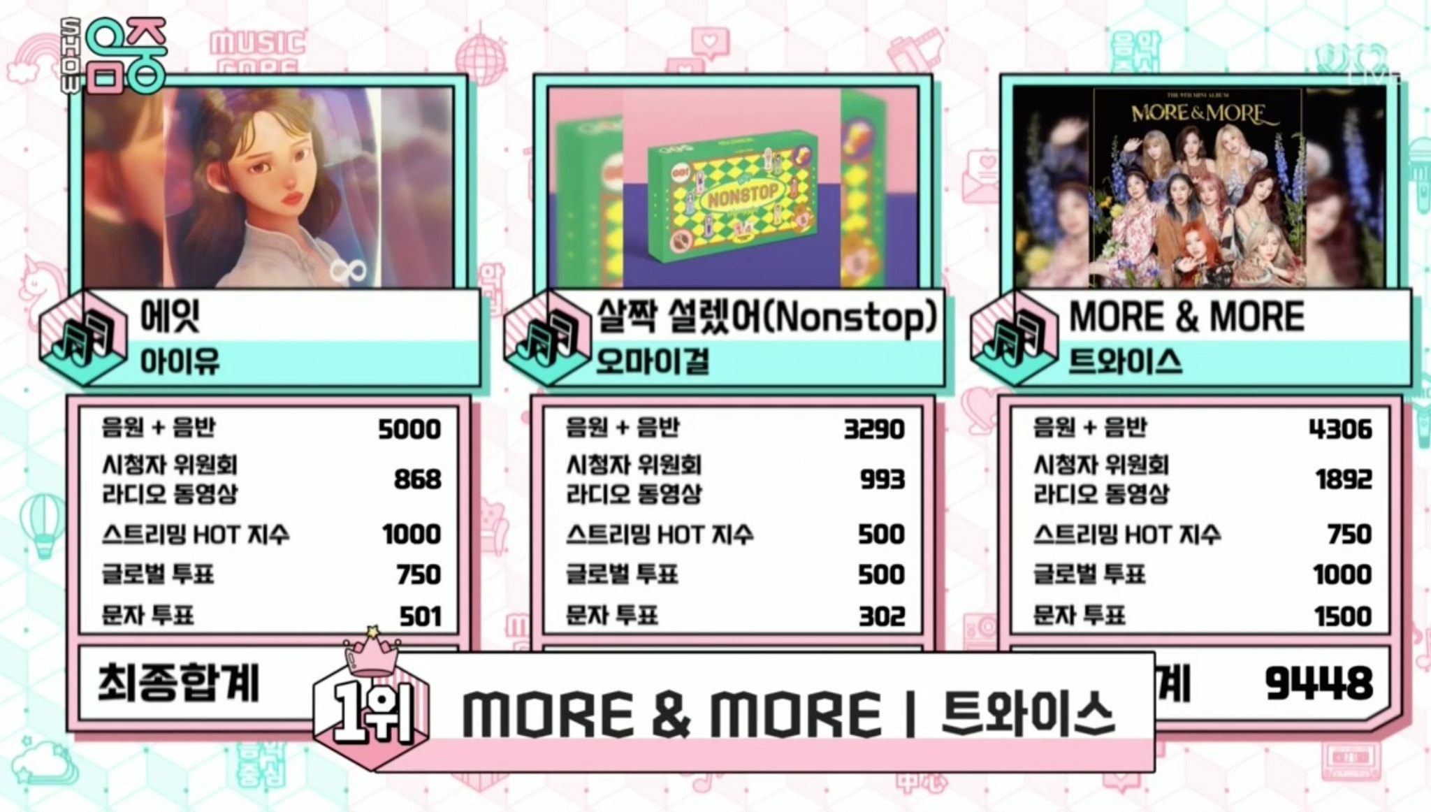 Cụ thể, với số điểm 9448, More & More của TWICE đã vượt mặt Eight (IU) và Nonstop (Oh My Girl) để mang về chiếc cúp cho người chiến thắng. Đây là chiếc cúp thứ 8 mà TWICE giành được với More & More tại Show! Music Core, đồng thời nâng tổng số lần nhận cúp của nhóm lên 105 lần.