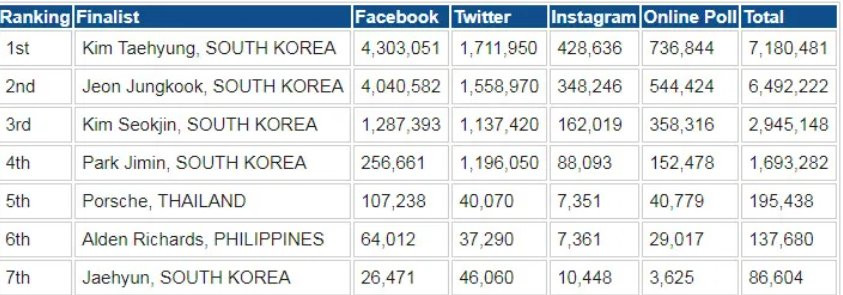 Cụ thể, vào ngày 7/4, theo kết quả được Starmometer thông báo, V (BTS) tiếp tục dẫn đầu BXH Ultimate Asian Heartthrob 2020 với số điểm bình chọn trên các hệ thống vô cùng ấn tượng. Để đạt được No.1, anh chàng V nhận được tổng cộng 7.180.481 phiếu bầu (trong đó Facebook là 4.303.051, Twitter là 1.711.950, Instagram là 428.636 và online là 736.844). Đây không phải là lần đầu tiên nam thần V của BTS ghi dấu ấn tại vị trí No.1 của BXH Ultimate Asian Heartthrob 2020. Đây đã là năm thứ 3 liên tiếp anh chàng xuất sắc đạt được thứ hạng này.