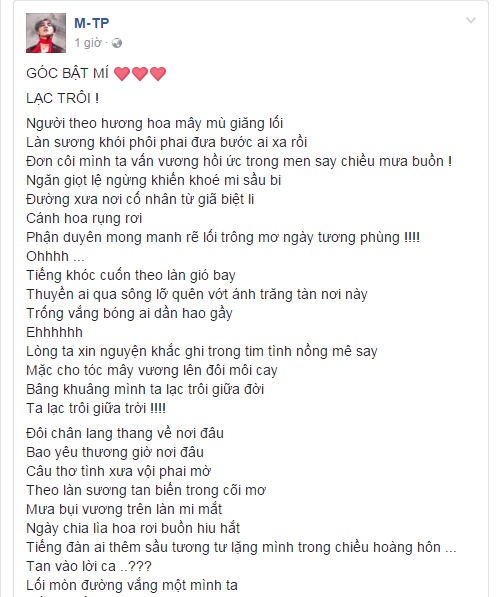 Chỉ còn chưa đầy 3 ngày nữa Sơn Tùng M-TP sẽ chính thức tung single Lạc trôi trong sự mong chờ tột độ của người hâm mộ. Không chỉ là sản phẩm đầu tiên của anh chàng sau khi chia tay Quang Huy, dường như Lạc trôi còn là “đứa con tinh thần” mà Sơn Tùng bỏ nhiều tâm sức quảng bá nhất từ trước đến giờ. Hình đếm ngược từng ngày, MV teaser bí ẩn hay những status “nhắc khéo” fan là chưa đủ. Tối nay (28/12), nam ca sĩ vừa chia sẻ toàn bộ lời bài hát Lạc trôi trên trang cá nhân.
