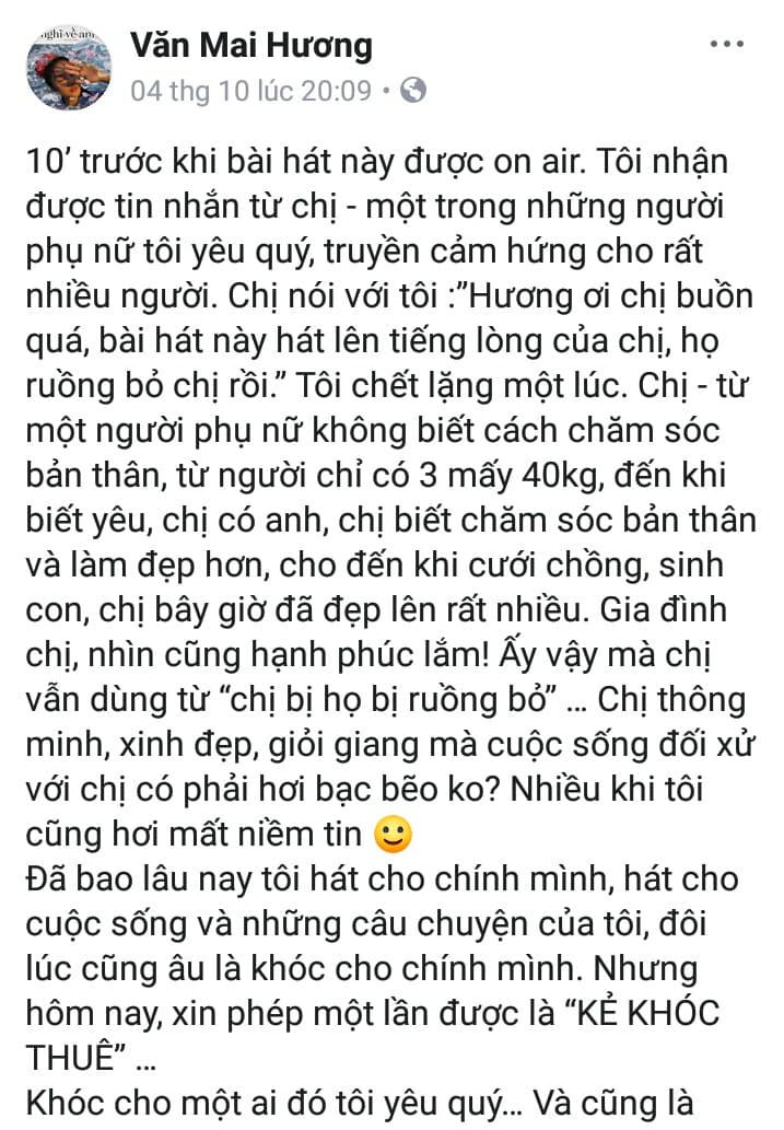Cụ thể, cô nàng này đã viết như sau: “10’ trước khi bài hát này được on air. Tôi nhận được tin nhắn từ chị - một trong những người phụ nữ tôi yêu quý, truyền cảm hứng cho rất nhiều người. Chị nói với tôi :”Hương ơi chị buồn quá, bài hát này hát lên tiếng lòng của chị, họ ruồng bỏ chị rồi.” Tôi chết lặng một lúc. Chị - từ một người phụ nữ không biết cách chăm sóc bản thân, từ người chỉ có 3 mấy 40kg, đến khi biết yêu, chị có anh, chị biết chăm sóc bản thân và làm đẹp hơn, cho đến khi cưới chồng, sinh con, chị bây giờ đã đẹp lên rất nhiều. Gia đình chị, nhìn cũng hạnh phúc lắm! Ấy vậy mà chị vẫn dùng từ “chị bị họ bị ruồng bỏ” … Chị thông minh, xinh đẹp, giỏi giang mà cuộc sống đối xử với chị có phải hơi bạc bẽo ko? Nhiều khi tôi cũng hơi mất niềm tin. Đã bao lâu nay tôi hát cho chính mình, hát cho cuộc sống và những câu chuyện của tôi, đôi lúc cũng âu là khóc cho chính mình. Nhưng hôm nay, xin phép một lần được là KẺ KHÓC THUÊ …Khóc cho một ai đó tôi yêu quý… Và cũng là khóc cho cả những người tôi không quen.”