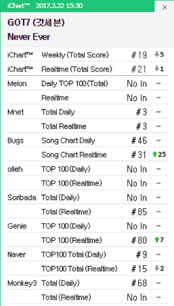 Sau ít ngày phát hành, album Flight Log: Arrival cùng ca khúc chủ đề Never Ever của GOT7 đã đạt được một số thành tích đáng khích lệ trên đấu trường quốc tế. Mặc dù Never Ever hiện đang văng ra khỏi top 100 MelOn và “làm ăn” khá chật vật tại sân nhà nhưng 7 chàng trai nhà JYP vừa vươn lên vị trí #1 BXH World Album của Billboard.