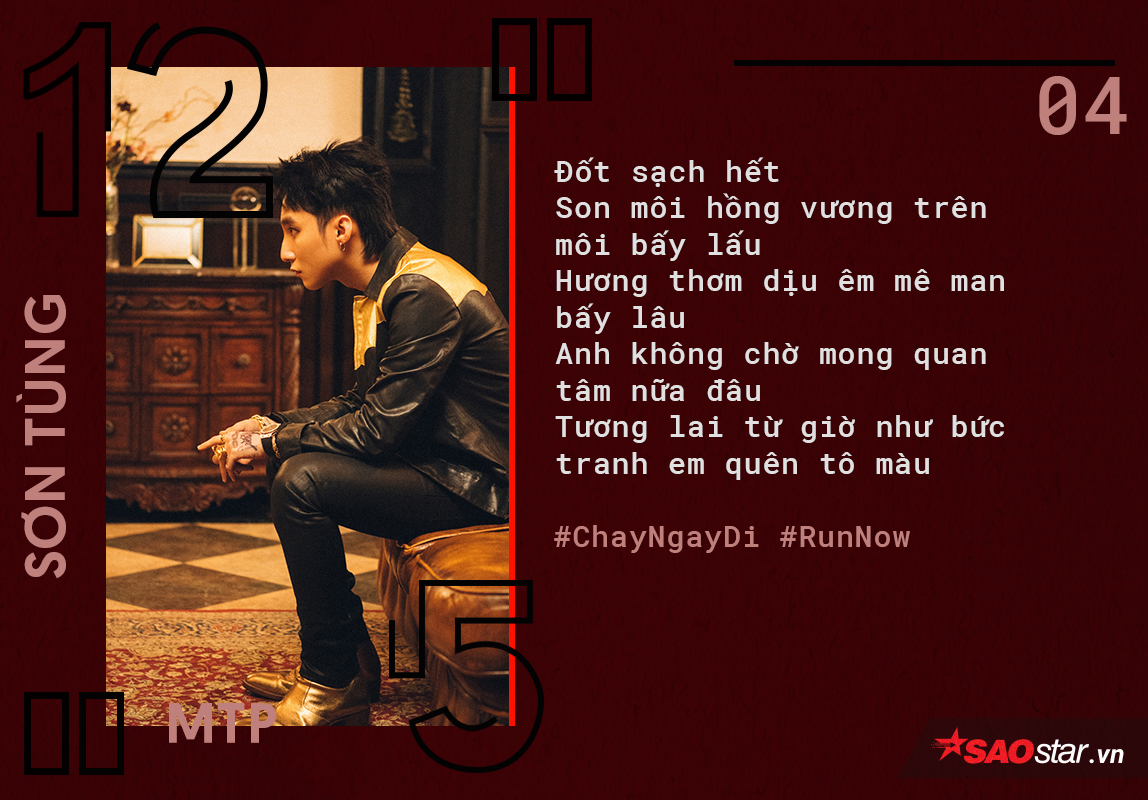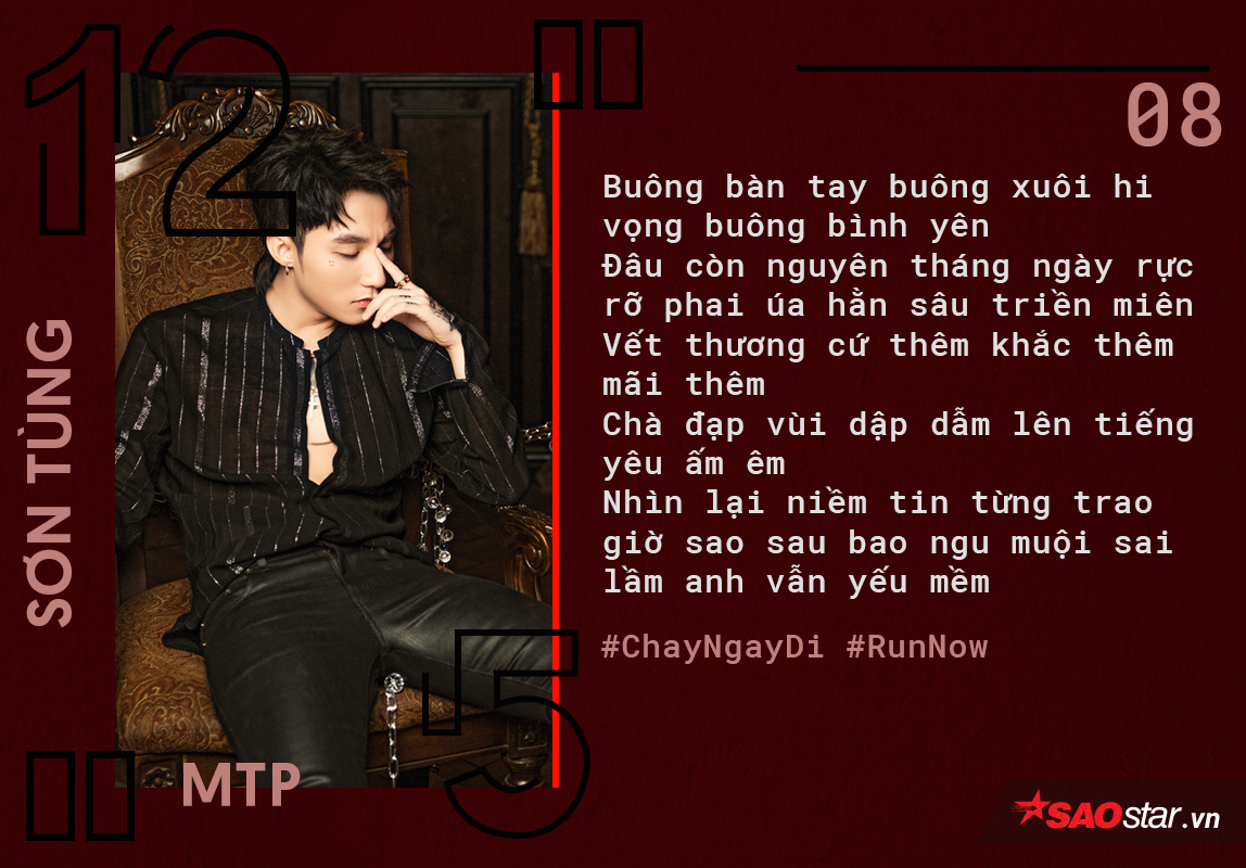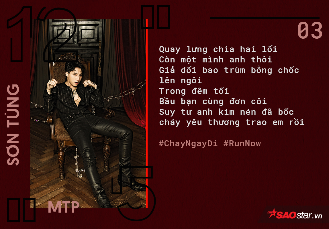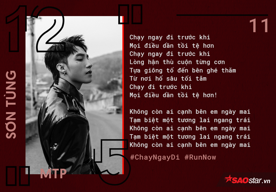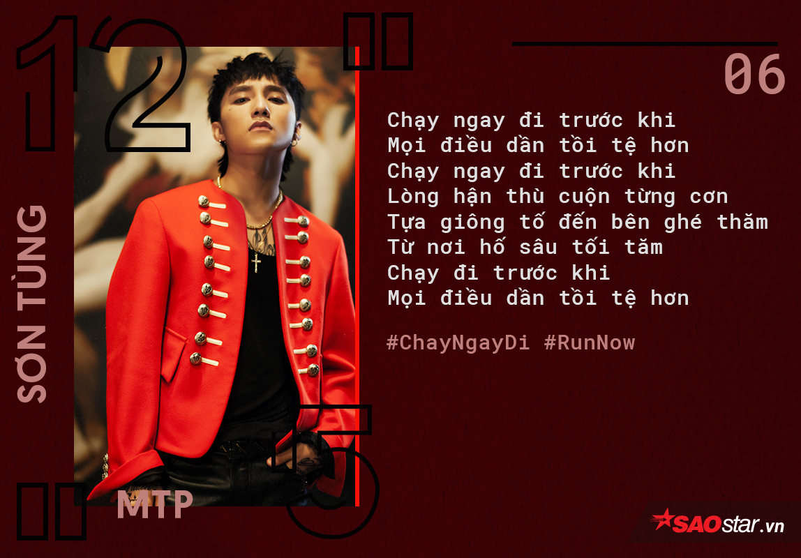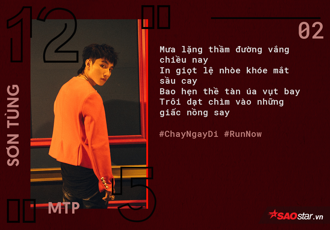 Saostar gửi đến bạn bộ hình mới toanh của Sơn Tùng kèm phần lyrics toàn bộ bài hát. Hy vọng, những hình ảnh này sẽ giúp hoàn thiện màn trở lại của nam ca sĩ gốc Thái Bình cũng như khiến khán giả nhanh chóng thuộc “nằm lòng” ca từ của Chạy ngay đi.