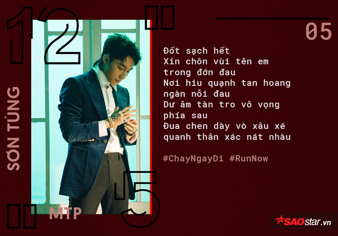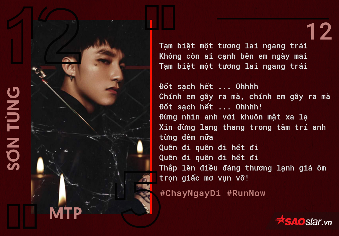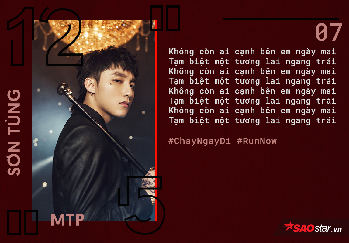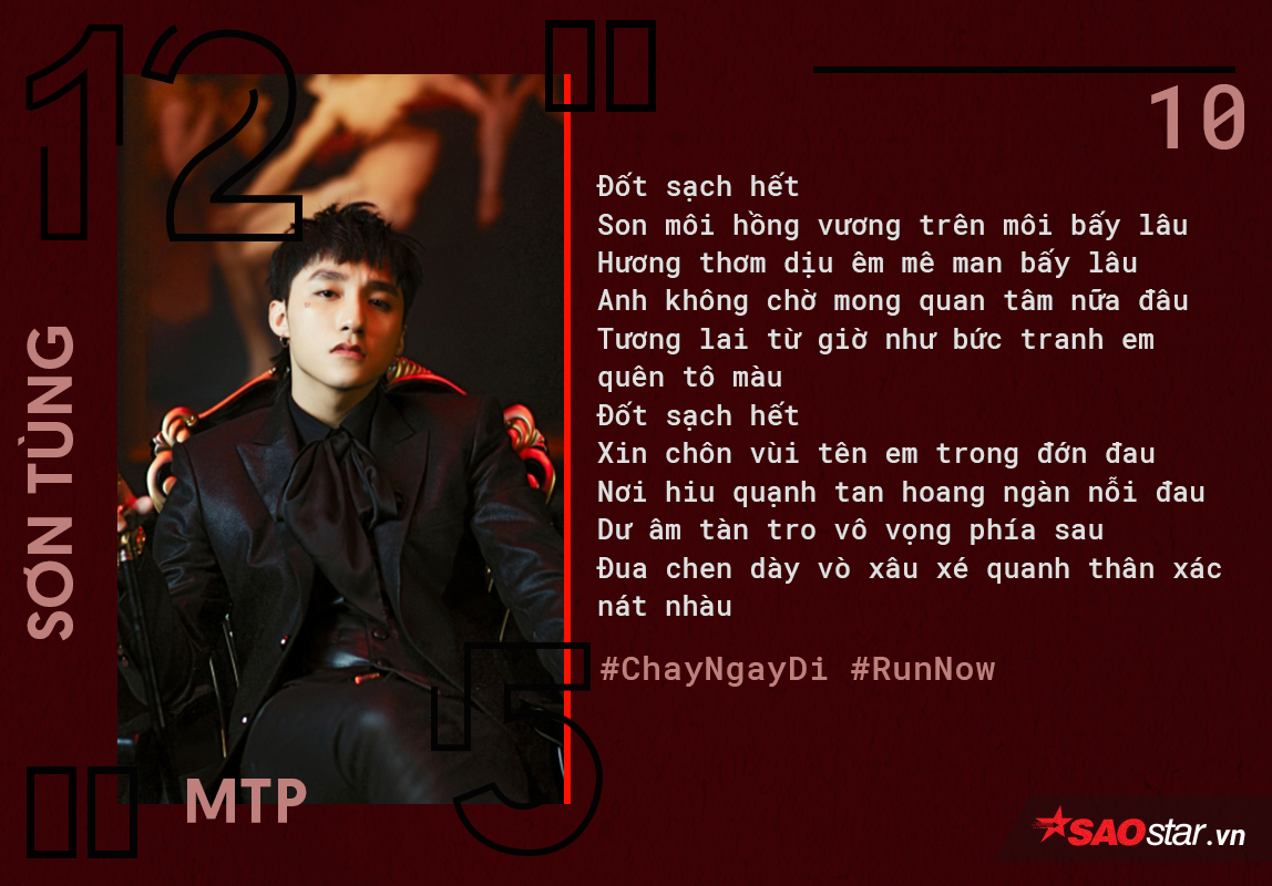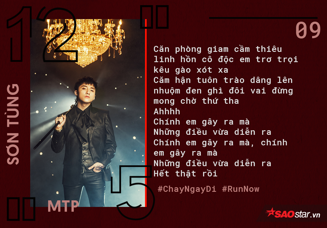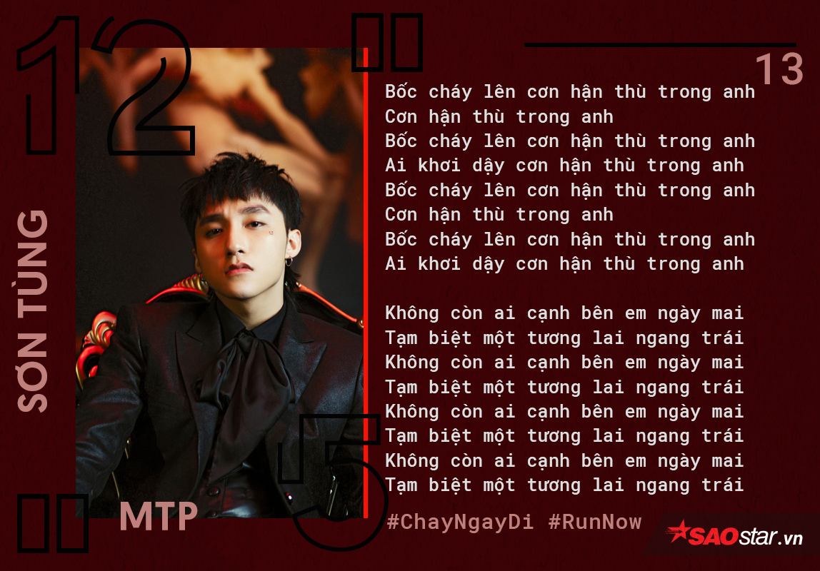 Saostar gửi đến bạn bộ hình mới toanh của Sơn Tùng kèm phần lyrics toàn bộ bài hát. Hy vọng, những hình ảnh này sẽ giúp hoàn thiện màn trở lại của nam ca sĩ gốc Thái Bình cũng như khiến khán giả nhanh chóng thuộc “nằm lòng” ca từ của Chạy ngay đi.